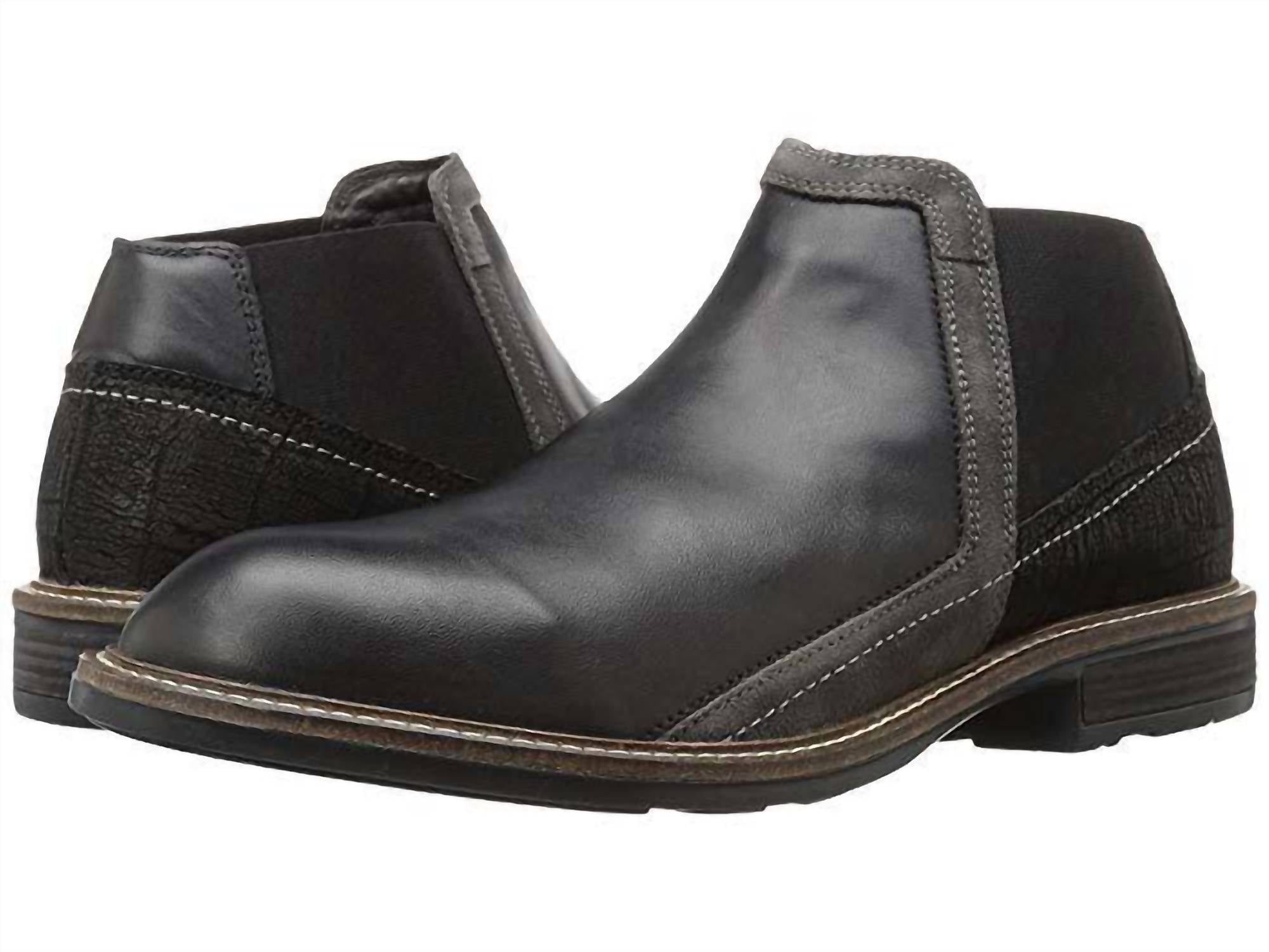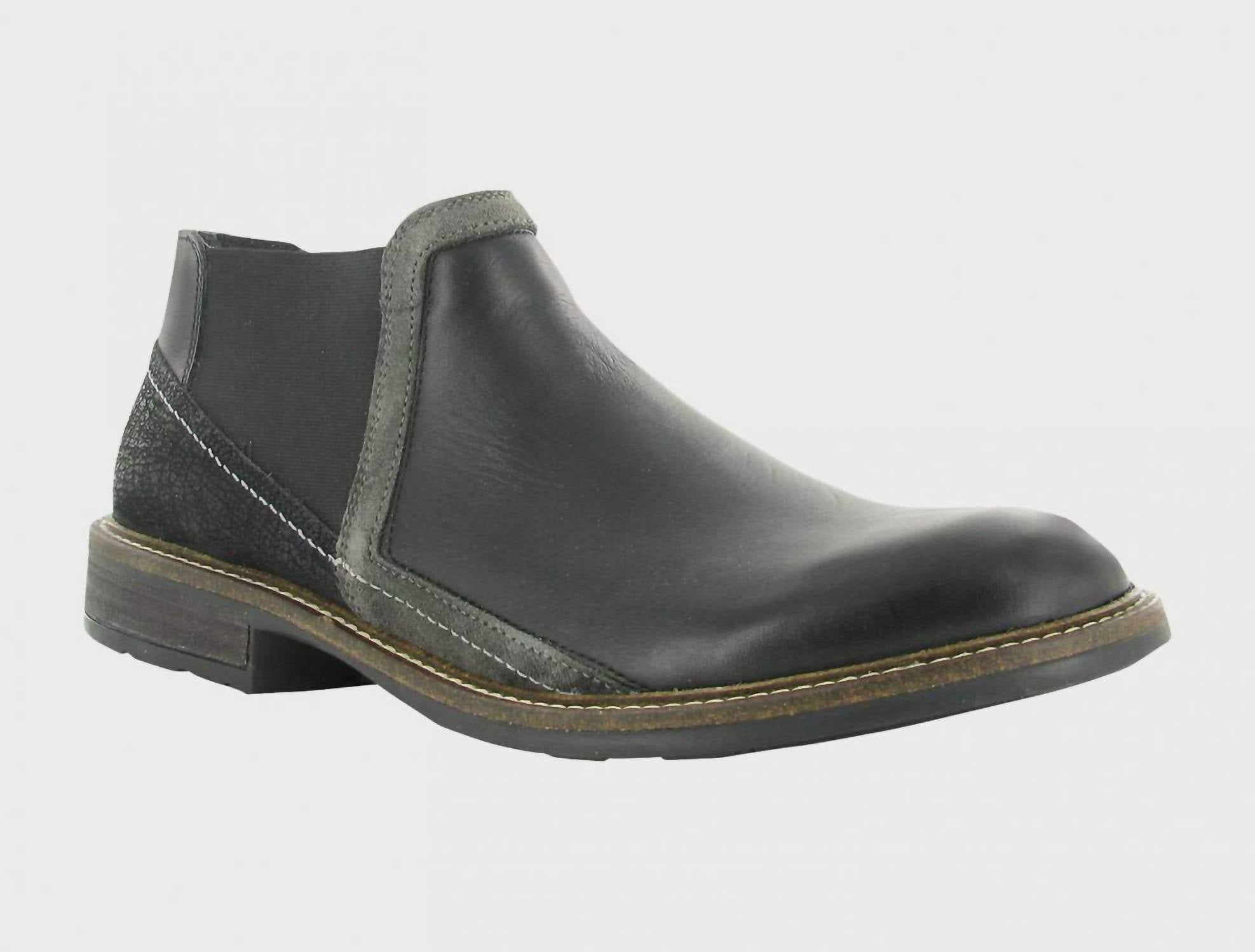 Step into sophistication with the Men's Business Leather Suede Boot by NAOT, designed for those elegant dinner parties. Crafted with a striking black leather and suede upper featuring detailed stitching, this boot offers uncomplicated style with its slip-on design and dual goring. The interior is enhanced by a padded technical lining, while the anatomic cork and latex footbed promises custom comfort, contouring to your foot over time. This versatile boot is completed with a slip-resistant polyurethane outsole and a classic flat heel, embodying minimalist elegance perfect for the spring season.