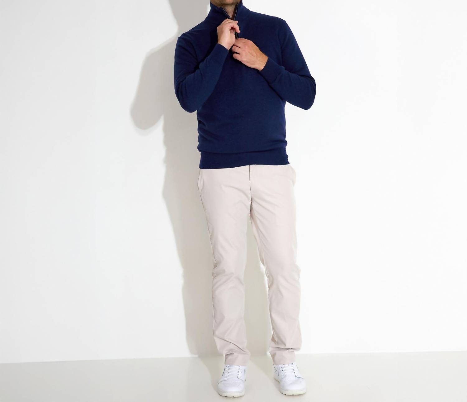 The Liffin Knitted Half-zip Windstopper by Abacus Sportswear US is perfect for men seeking warmth and style. It is crafted from a luxurious knit blend of Merino wool, polyamide, and acrylic, ensuring comfort and wind protection with its stretch lining. This navy windstopper features long sleeves, ribbed cuffs and hem, and a full zip closure for easy layering. Care instructions include machine wash and tumble dry, making it a practical athleisure piece for game day in spring.