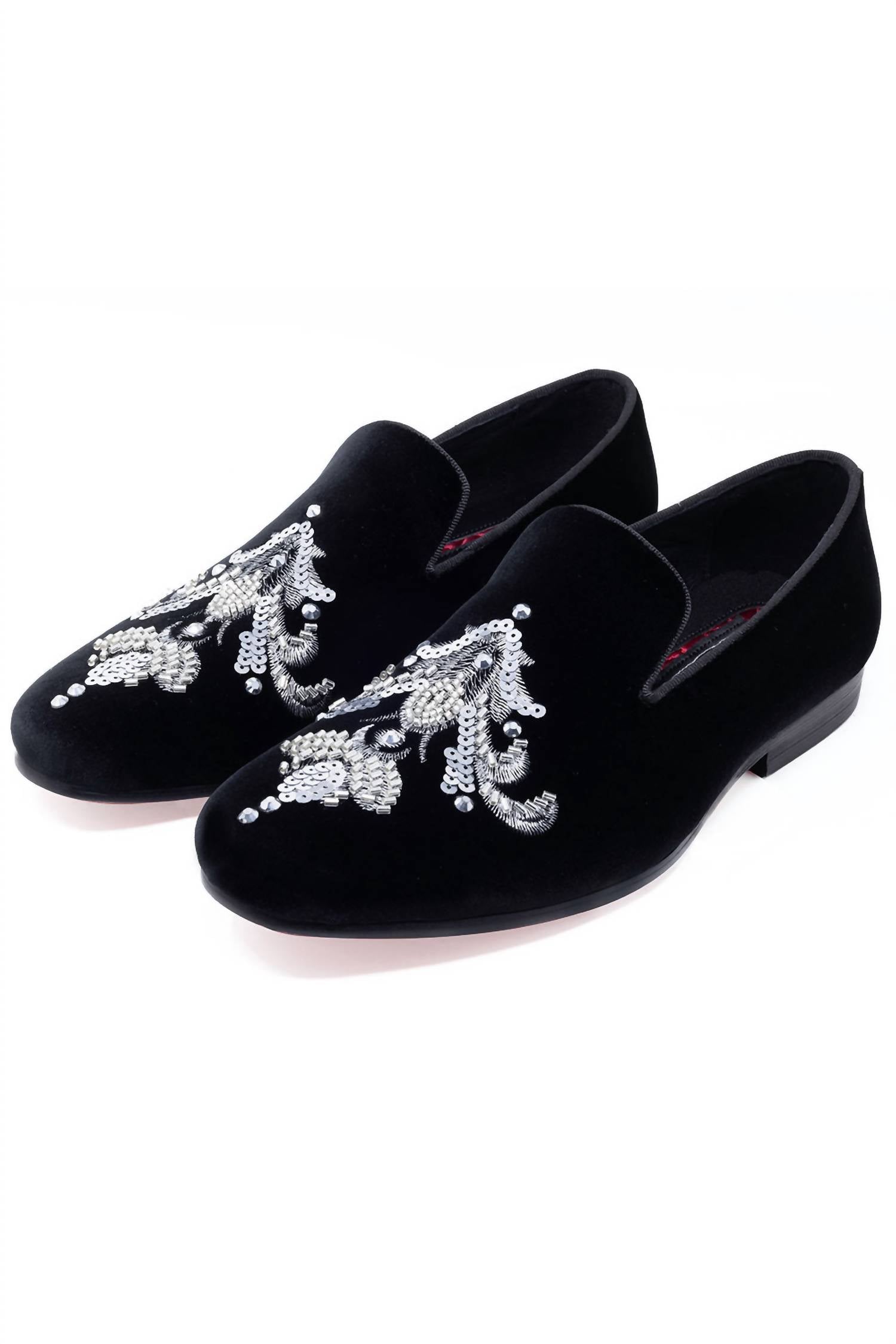 Elevate your shoe collection with the Men's Pearls Mod Slip-on Loafers by BARABAS, featuring an eye-catching black silver sequin and beads velvet design. These slip-on loafers boast a sophisticated allure with their leather lining and iconic red soles adorned with the Barabas logo. Designed for a comfortable fit, these loafers include an inside cushion and feature a flat heel with a round toe shape suitable for winter occasions. For upkeep, spot cleaning is recommended, ensuring these shoes maintain their elegant appearance for any event.