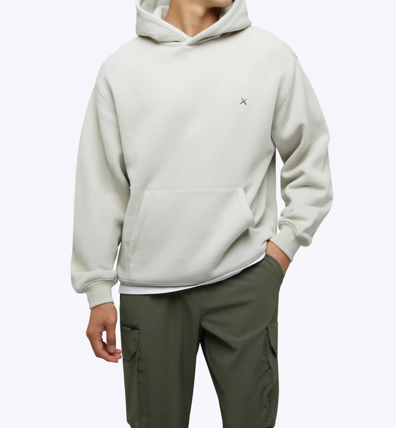 Elevate your loungewear collection with the CUTS Divine Fleece Hoodie in Parchment, designed for luxurious comfort and a heavy-weight feel. This men's hoodie features long sleeves and is crafted from a super soft cotton blend composed of 74% cotton and 26% polyester, with rib trims of 98% cotton and 2% elastane. Its pull-on style includes a structured hood, kangaroo pocket, and dropped shoulders, with a unique custom gunmetal X logo detailing. Featuring a classic fit that offers more room in the chest, arms, and torso, the body length varies from XS at 26 ½” to 2XL at 29 ¾”.