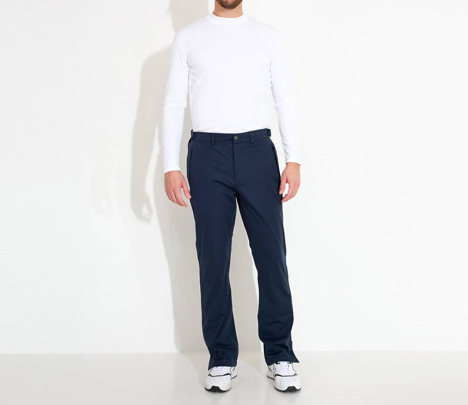 Meet the Bounce Rain Trousers by Abacus Sportswear US, crafted in solid navy for any unpredictable weather. With a zip closure and straight-leg design, these trousers provide a regular fit and mid-rise waist, perfect for layering over your golf attire. The trousers are equipped with multiple pockets for convenience, and their advanced fabric is both waterproof and breathable, ensuring all-day comfort. Ideal for Game Day or athleisure wear, they can be machine washed and tumble-dried for easy care.