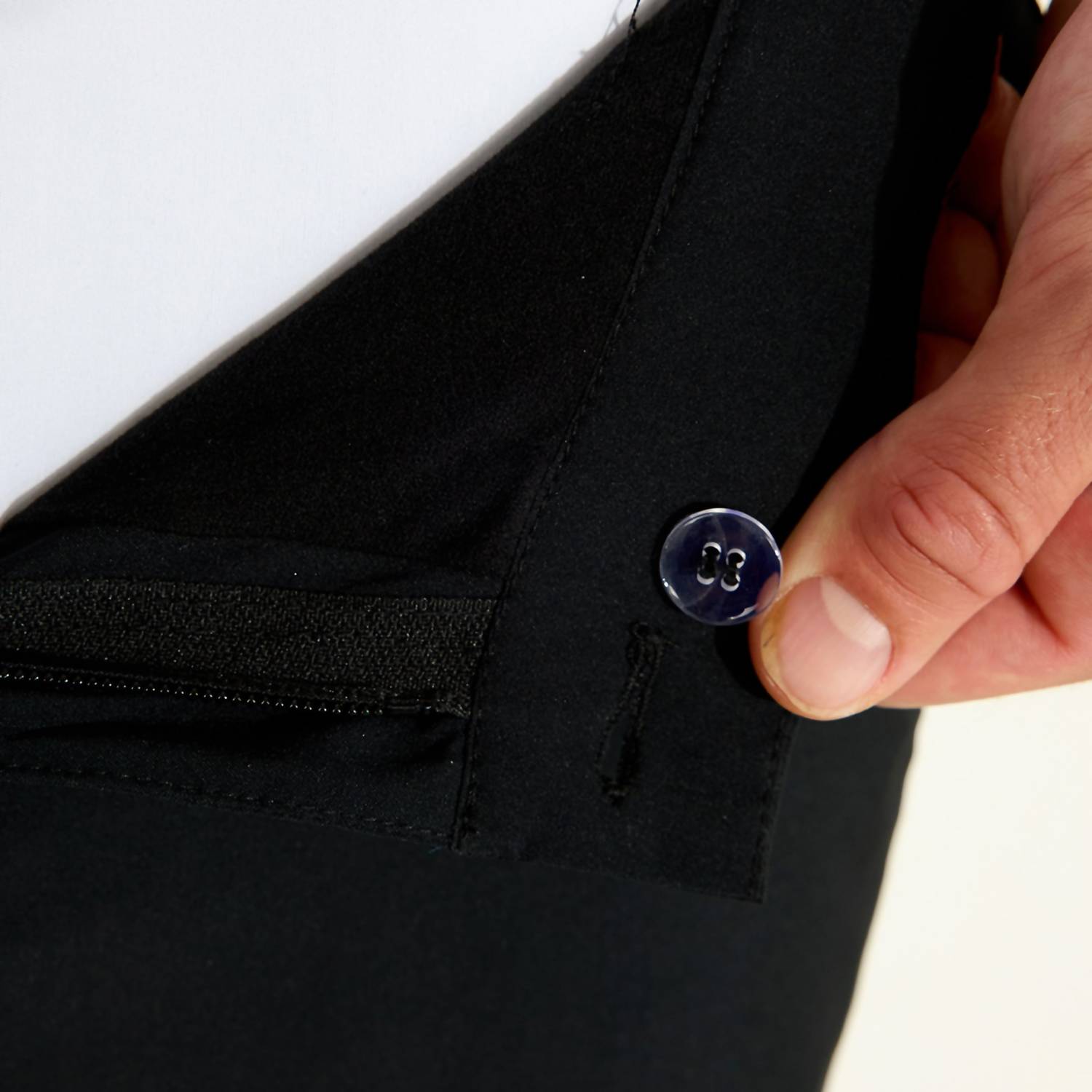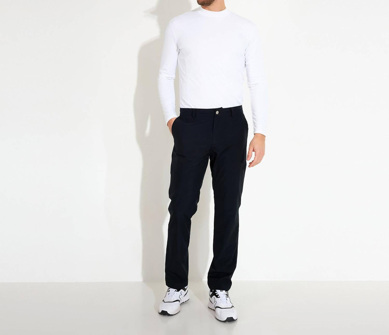 Discover the Links Warm Waterproof Trousers by Abacus Sportswear US, designed for the modern man who embraces the elements. These black, solid-pattern trousers combine waterproof (WP 10,000) and breathable (MVP 10,000) polyester with a brushed tricot lining, ensuring warmth and comfort. With a regular fit and mid-rise elasticated back waist, the pants feature a practical zip closure and multiple pockets, perfect for a rainy golf game or a woodland walk. Complete with a straight-leg style, these versatile trousers are machine washable and can be tumble-dried, embodying the athleisure trend.