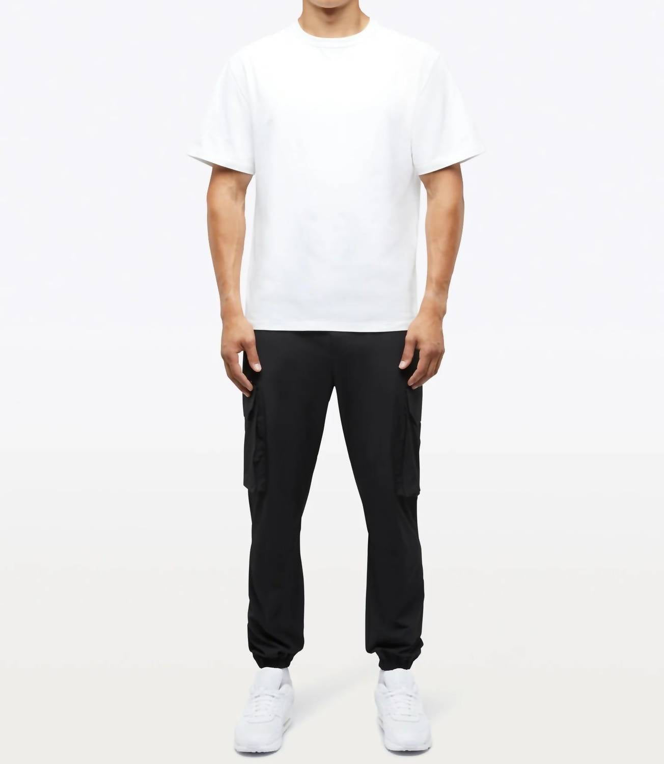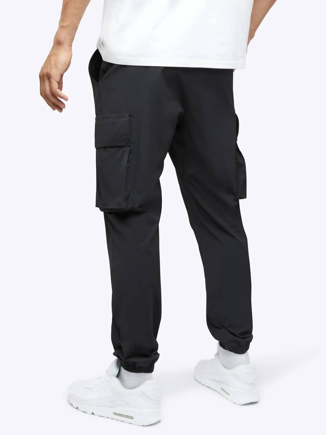 Discover the Traverse Cargo Jogger by CUTS, crafted with an 85% nylon, 15% spandex blend for unmatched comfort and flexibility. This slim-fit jogger features a 28.5” inseam, side cargo pockets with snap closure, and an external drawcord for a secure fit. Designed in classic black and featuring tapered leg style with elastic waistband and leg openings, it's perfect for both adventures and sophisticated outings. While care specifics are not detailed, its minimalist design ensures versatility for any occasion.