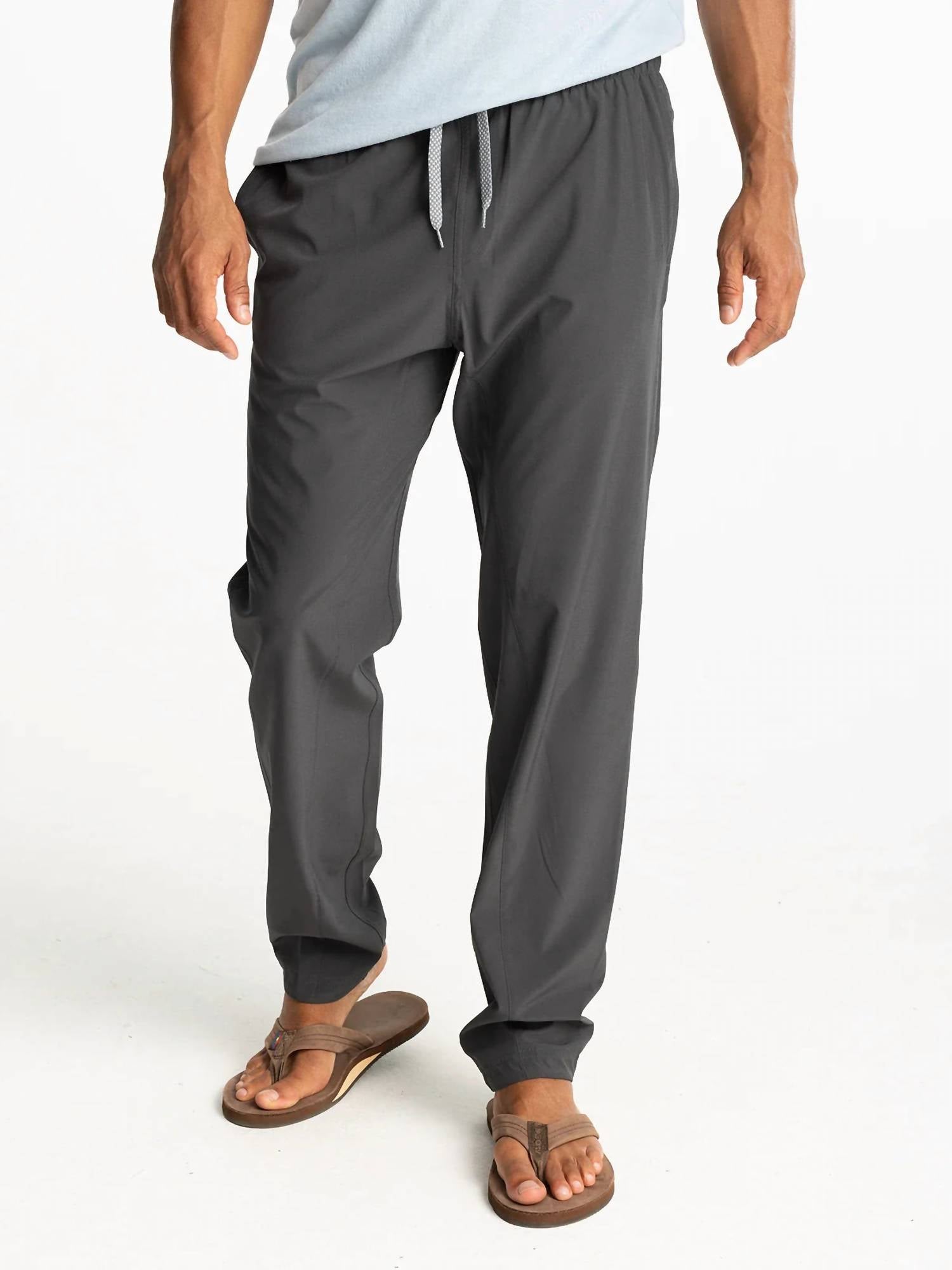 The Breeze Pants by FREE FLY offer an ultra-lightweight and airy feel in a solid Black Sand color, perfect for the Spring season. These men's sweatpants feature a tapered leg style with UPF 50+ for sun protection and a pull on elastic waistband with drawcord for custom comfort. The 4-way stretch material provides freedom of movement, making them great for travel or water activities. Practical pockets include on-seam hand pockets and a secure back zipper pocket for essentials.