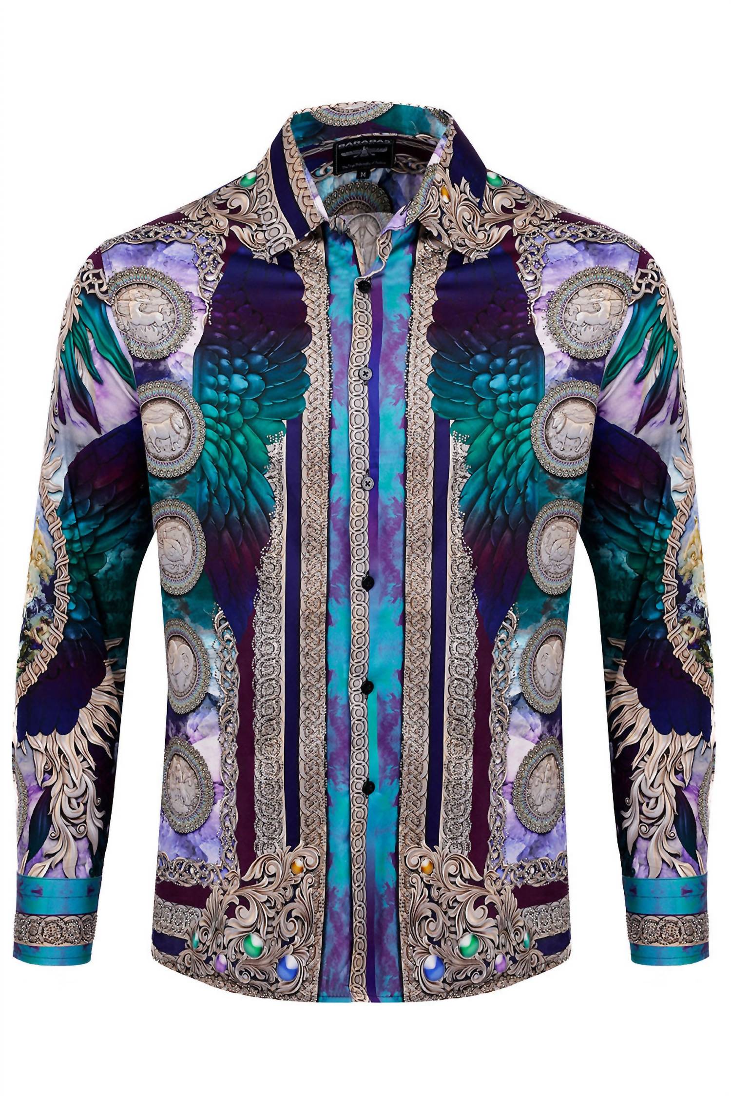 Experience the luxurious appeal of the Men's Striking Look Rhinestone Long Sleeve Shirt by Barabas. This casual button-down shirt features long sleeves, a distinctive hand-placed rhinestone Baroque design, and a captivating angel wings and animal print pattern. Crafted from a 97% Cotton and 3% Spandex blend, it provides a lightweight and slim fit. Closure is via classic buttons, and care is simple with a dry clean only instruction.