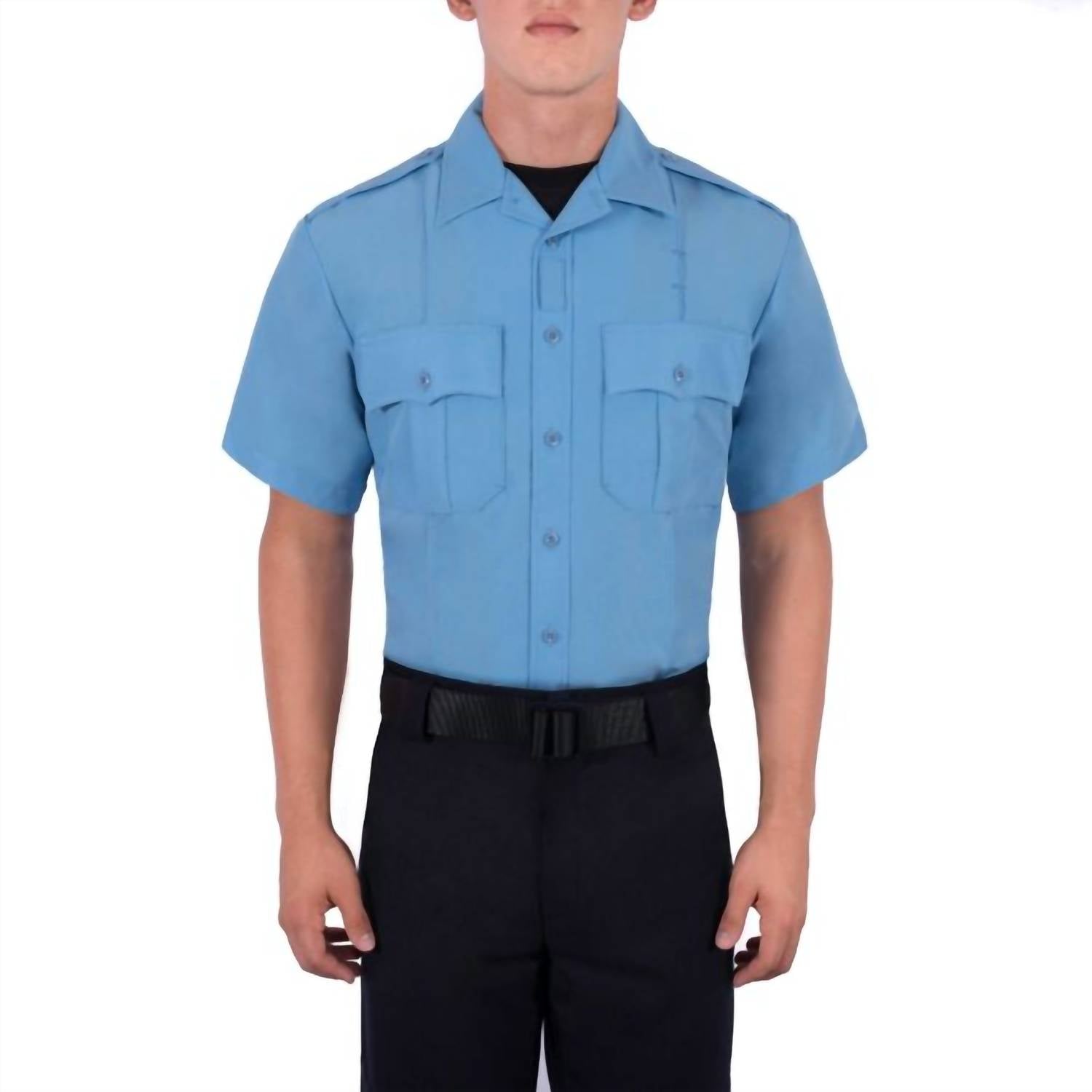 Introducing the Blauer Short Sleeve Polyester Supershirt® in a sophisticated Medium Blue, perfect for any man's workwear wardrobe. This shirt is crafted from an 8 oz. washable 100% fade-resistant polyester with a 10% stretch and wicking finish, enhanced by stretch nylon mesh side panels for superior breathability and a tapered fit. Featuring a zippered front with mock buttons, adaptive visibility reflective trim, and special function pleated patch pockets with hook-and-loop flaps, this shirt is both functional and stylish. Care is a breeze with machine wash on a gentle cycle and tumble dry on low, making it a practical choice for everyday wear.