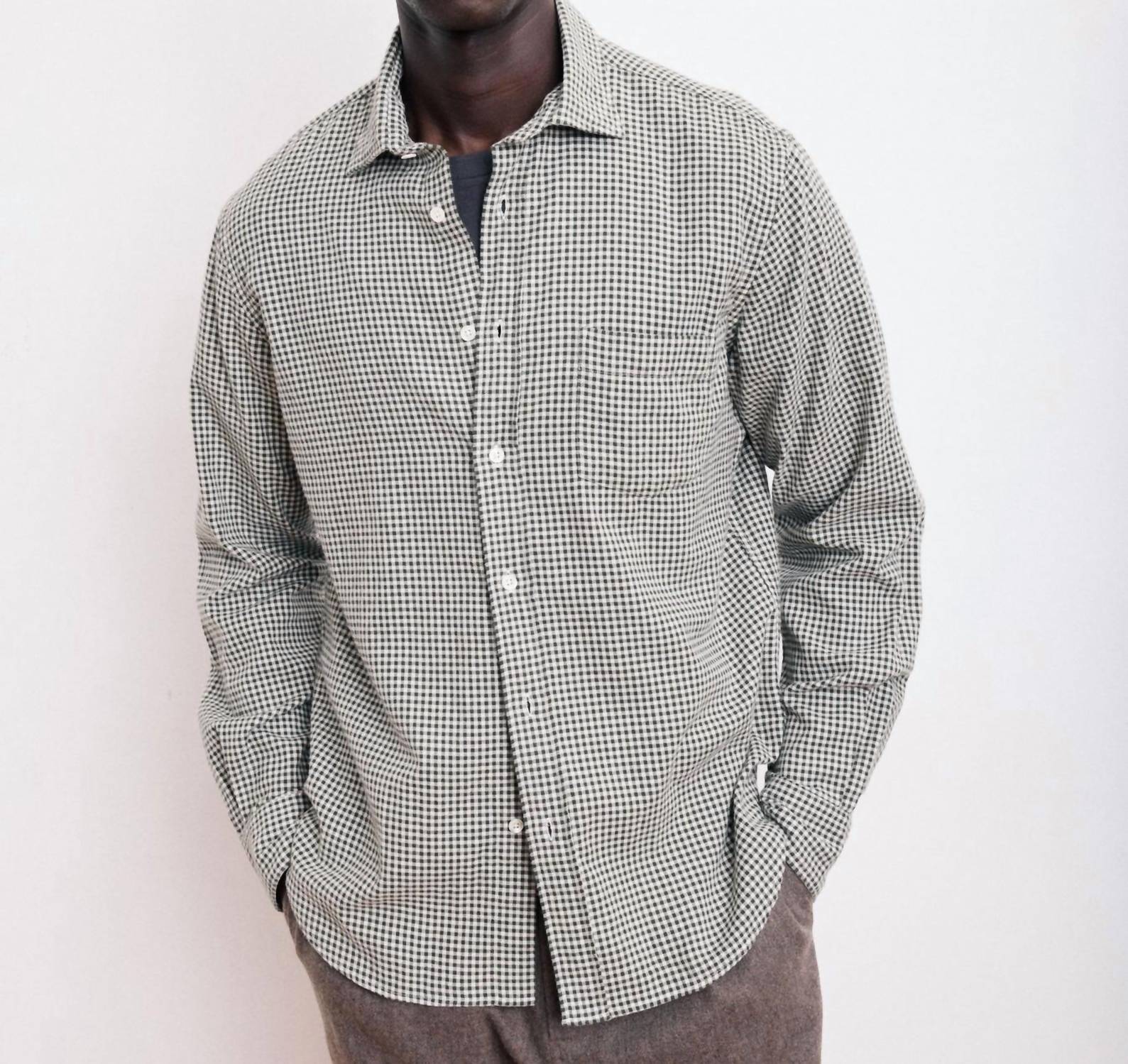 Experience casual elegance with the Paul Brushed Checked Flannel Shirt by Hartford, showcasing a vintage plaid and check pattern in green and ivory. This long sleeve shirt is crafted from brushed cotton flannel and features a regular fit with a semi-Italian soft collar and a practical chest pocket. Made in Morocco, it secures with mother-of-pearl buttons, perfect for a Thanksgiving holiday party. Ideal for spring, this shirt embodies effortless style and versatility.