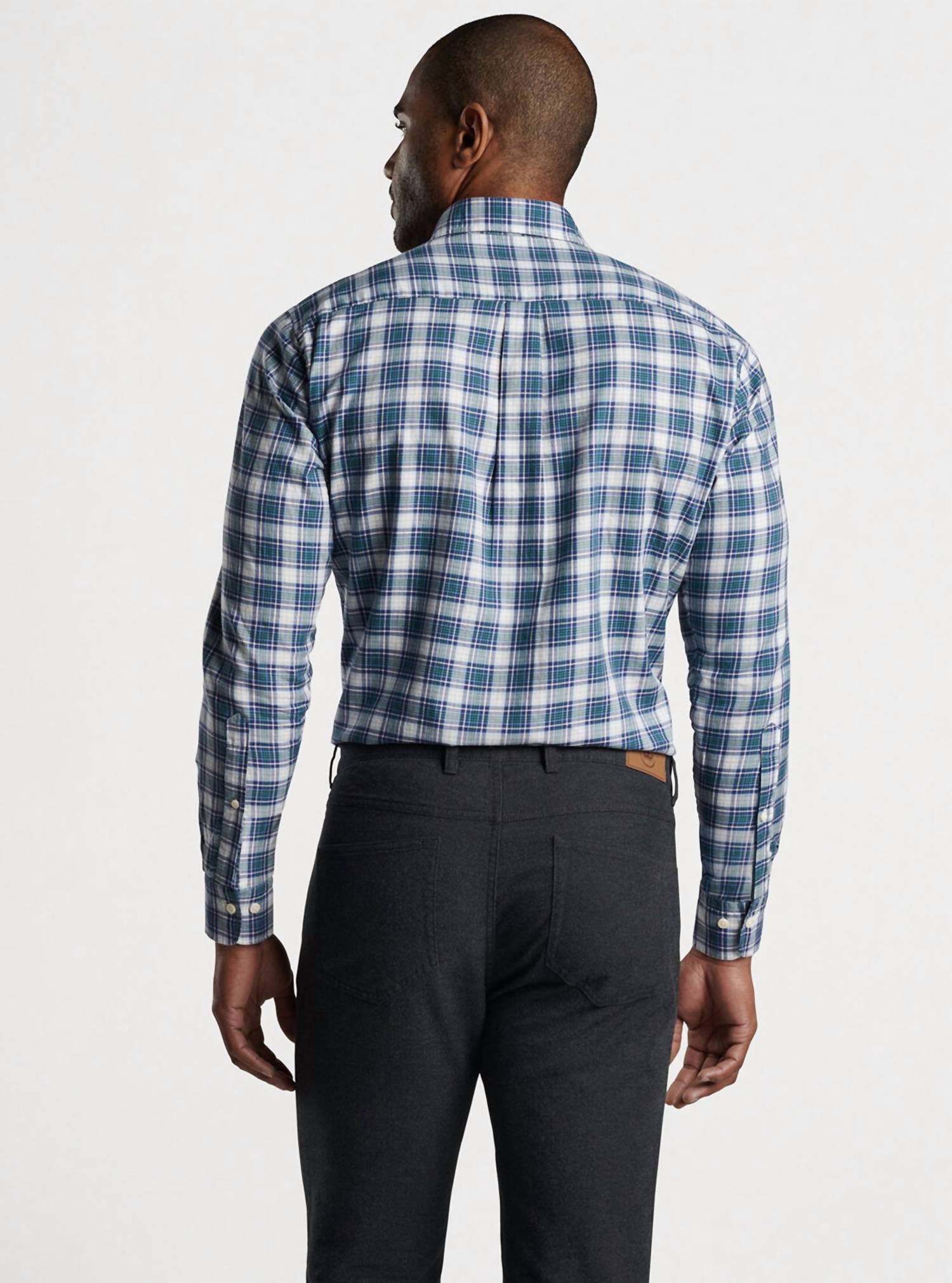 Introducing the Men's Seymour Cotton Sport Shirt by Peter Millar, a stylish choice in navy plaid designed for ultimate comfort. Made from ultra-soft and breathable cotton, this shirt features a button-down collar and long sleeves that end in double-button barrel cuffs. Closure type: Button closure. Care: Machine wash and lay flat to dry.