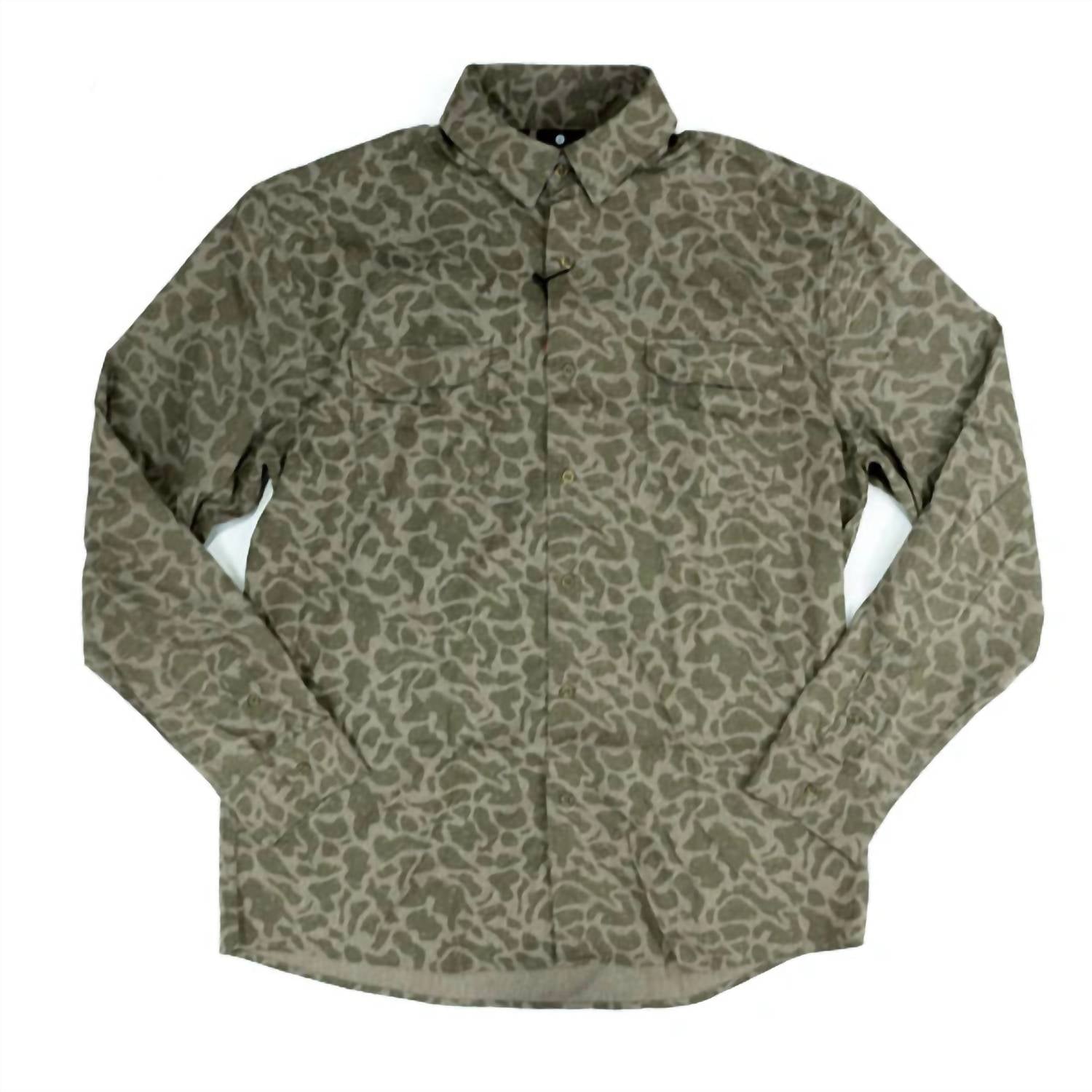 Discover the Southern Marsh Men's Merida Mar Performance Shirt, an essential for your outdoor escapades. With moisture-wicking long sleeves and a camo print, this Polyester piece promises both comfort and protection. The shirt features a split tail, vented back, and two buttoned chest pockets, accentuated by logo-engraved buttons. Closure: Button Closure. Care: Machine wash. This versatile top includes a microfiber sunglasses cleaner, ideal for spring adventures or a Western-themed dinner party.