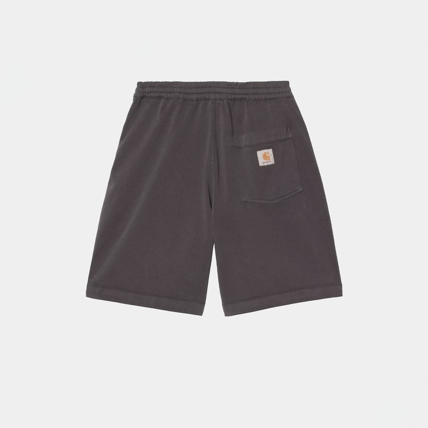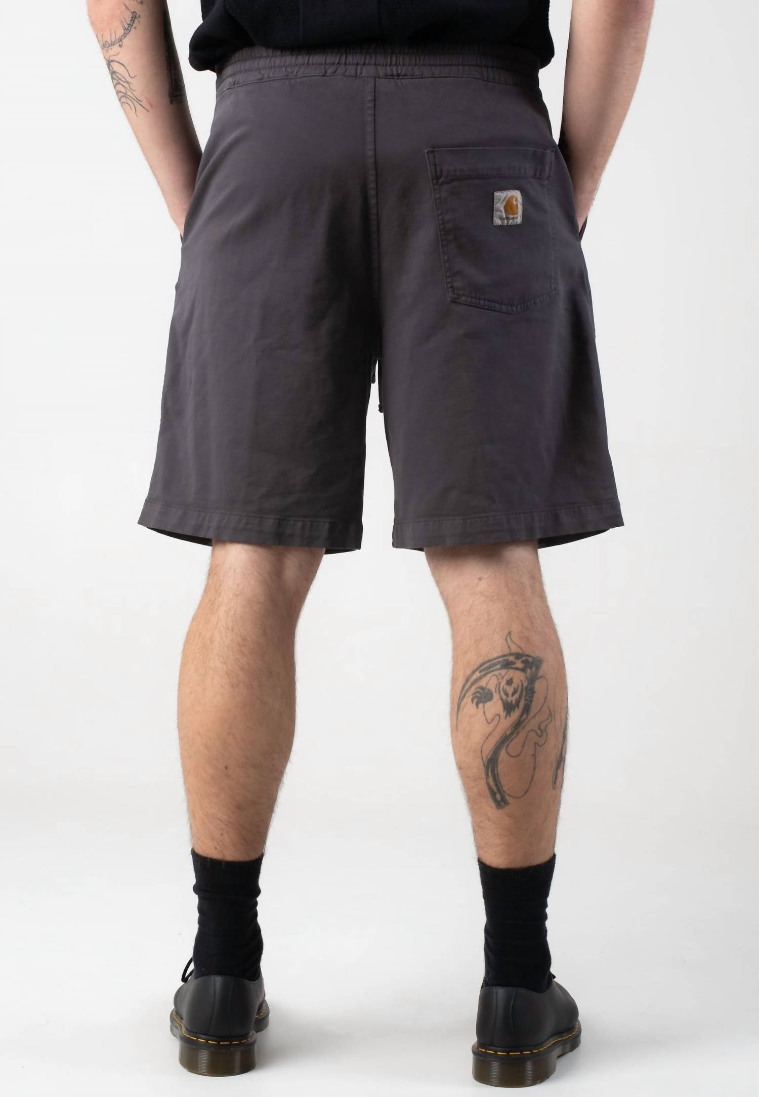 Introducing the Floyde Pull On Shorts by Carhartt WIP, crafted for both comfort and urban style. These medium-length shorts feature a relaxed fit with an elastic waistband for easy wear, available in a solid graphite color. The composition includes 51% Lyocell, 47% Cotton, and 2% Elastane in a durable twill fabric, weighing 10 oz. Designed with practicality in mind, they include two slant front pockets and a back pocket. Care instructions suggest machine washing warm, tumble drying on low heat, and ironing with high heat as needed.