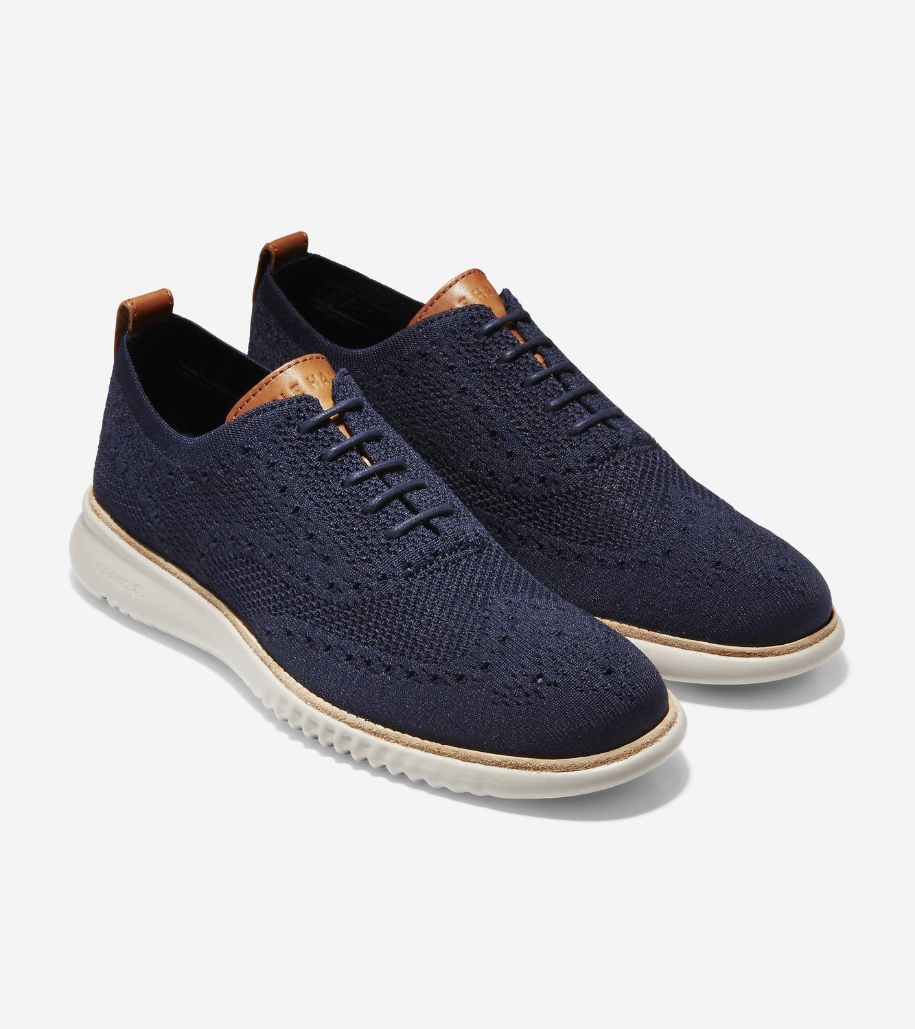 Experience the fusion of style and performance with the Men's 2 Zerogrand Wingtip Oxford Sneaker by Cole Haan, crafted for the modern man's athleisure wardrobe. The Marine Blue Stitchlite Grey sneaker features a woven upper for breathability and a precision-constructed design that enhances airflow and cooling. A meticulous jersey stitch topline ensures easy wear, while the tight forefoot knit offers superior stability. Equipped with an EVA midsole, rubber outsole, and innovative Grand.ØS dynamic energy foam, this sneaker provides exceptional comfort and flexibility for your active lifestyle.