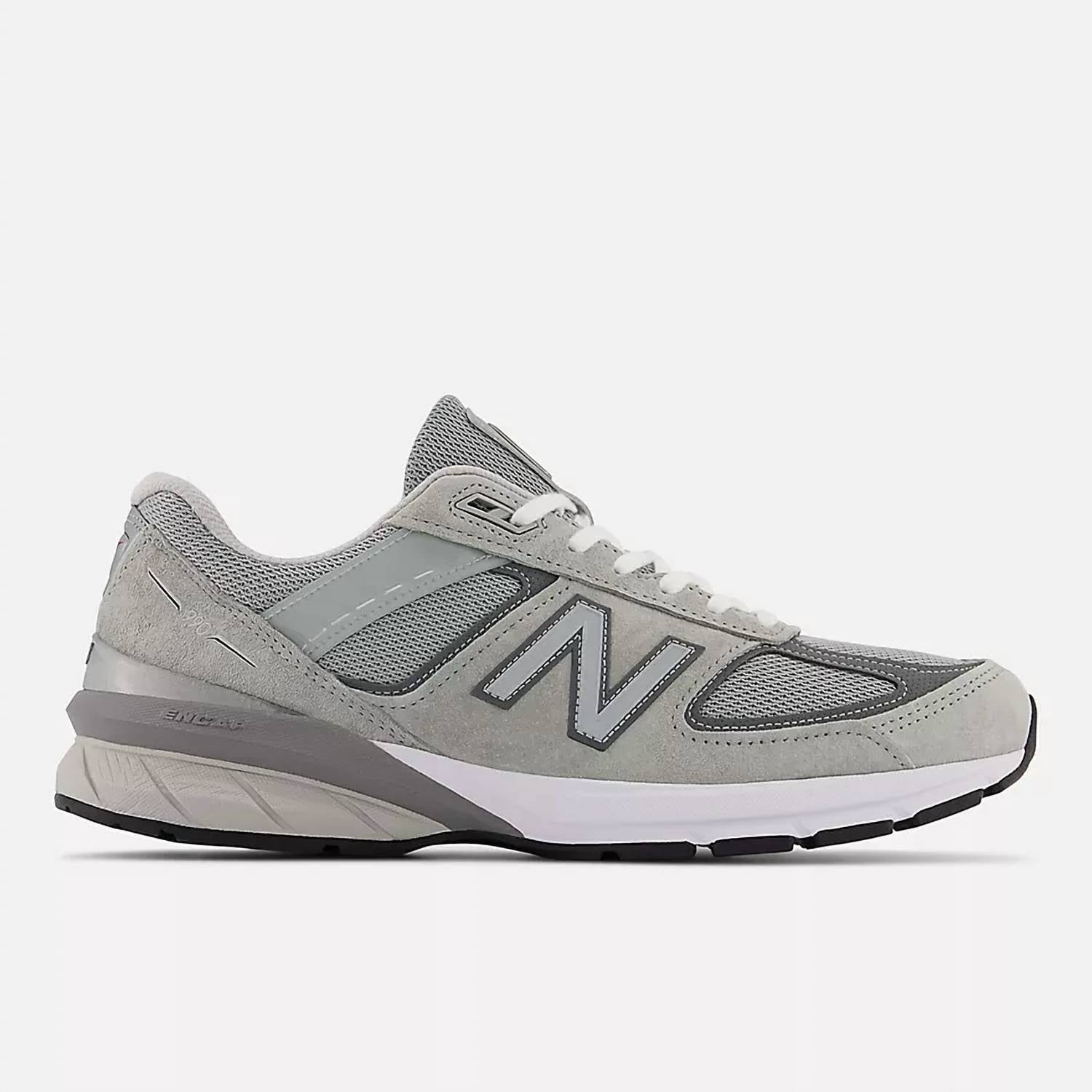 Elevate your summer athleisure style with the Men's 990v5 Shoes by New Balance, designed for fitness and workout occasions. Crafted with premium suede in a versatile grey color, these sneakers are perfect for active adults. Featuring a round toe and flat heel, they offer both comfort and functionality. Make these New Balance shoes your go-to choice for effortless, on-trend summer activities.