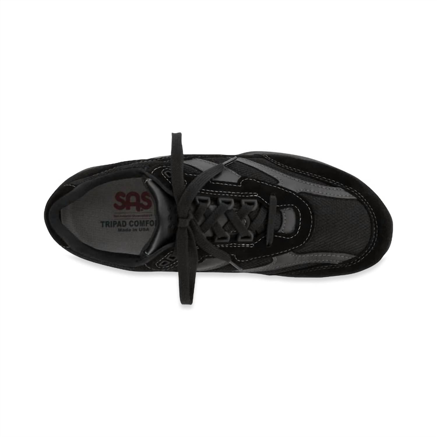Introducing the Men's Journey Walking Sneakers by SAS, a perfect blend of style and comfort for active men. These sneakers feature a leather and mesh upper for breathability and durability, designed to naturally accommodate your foot shape. Crafted in a classic black color, they include an exclusive EZ Lace system for a snug, adjustable closure. Equipped with a CoolStep removable footbed and TRIPAD® Technology, these sneakers provide excellent shock absorption and support. Heel height is 1.75", offering stability and comfort throughout your day.