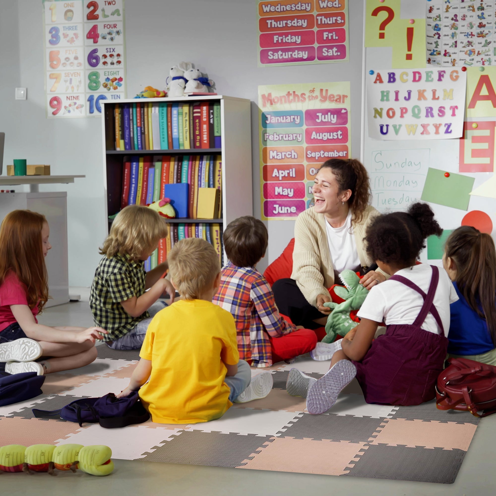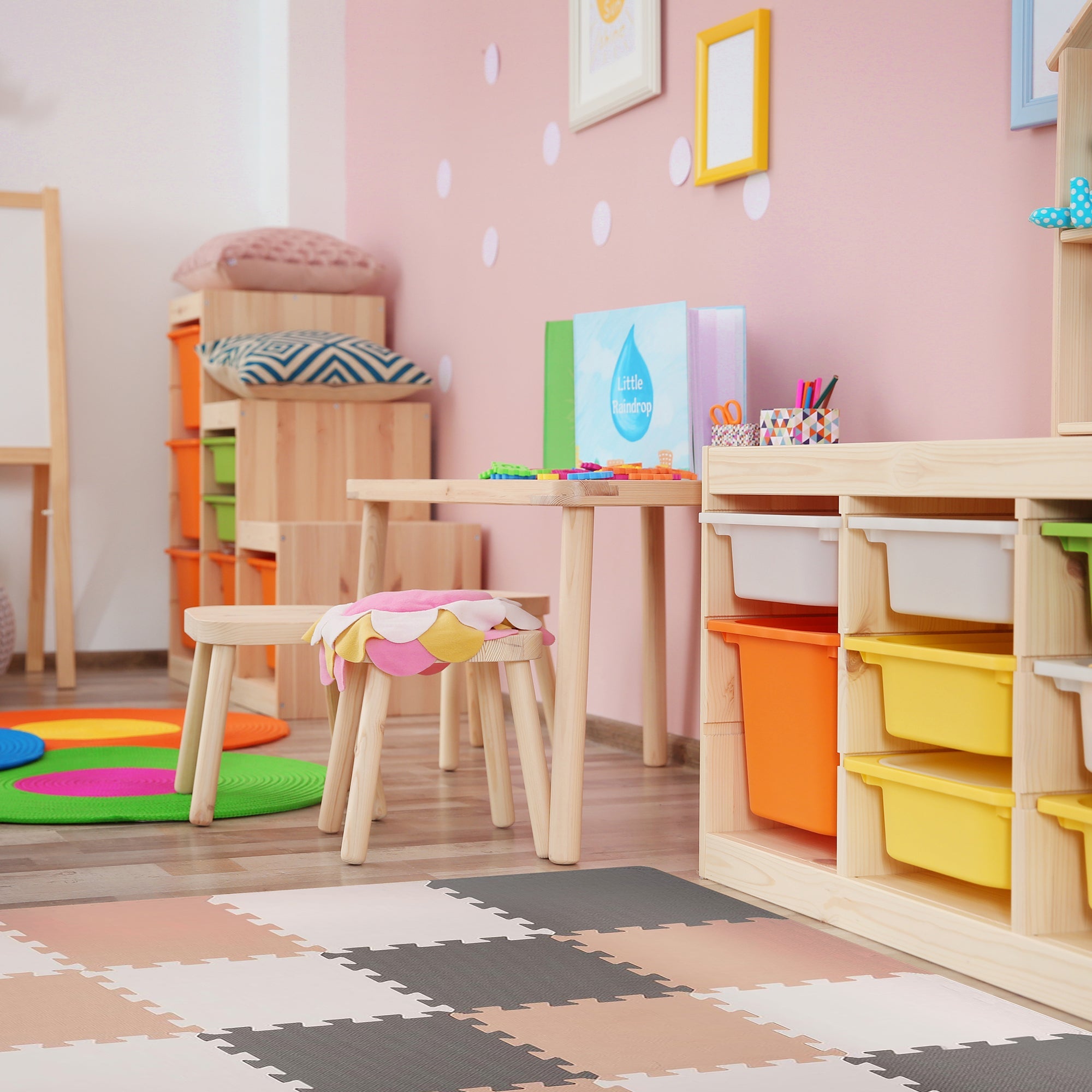 - Com esquema de cores em creme, cinza e bege, este pacote de tapetes interligados cobre até 16 pés quadrados de espaço de jogo, com cada peça medindo 1 pé quadrado