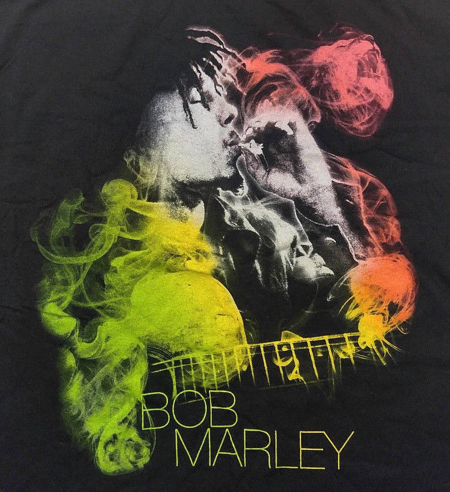 Celebrate your love for reggae with the Bob Marley Men's Guitar Smoke Short Sleeve T-shirt in classic black. Featuring a graphic of Bob Marley with a vibrant colored smoke effect, this tee is crafted from 100% cotton, providing comfort and breathability. Designed with a crewneck and a pull-on closure, it offers effortless wear. Care instructions include hand washing for maintaining its vibrant design, making it a perfect addition to your spring streetwear collection.