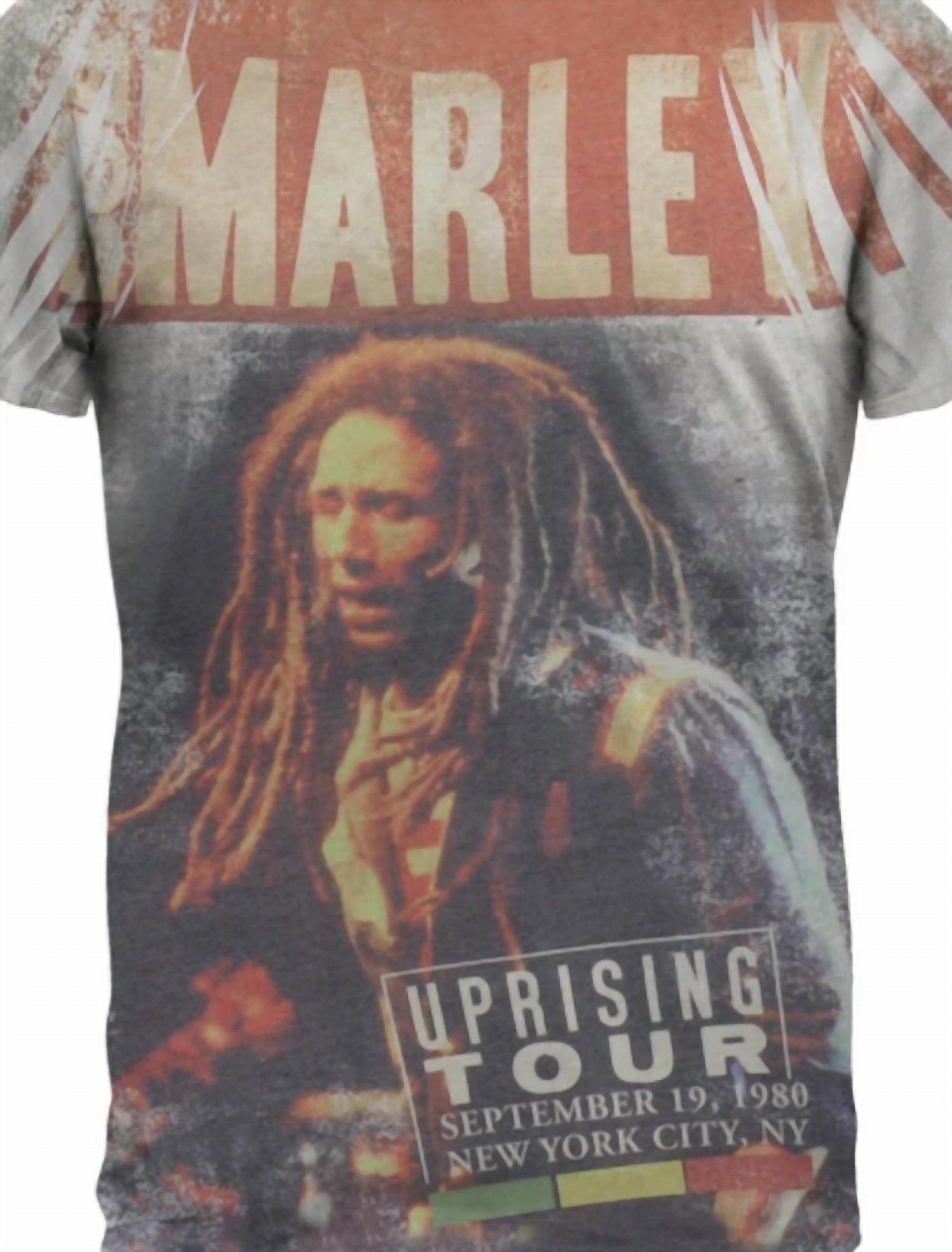 Celebrate your love for reggae with the Men's Uprising Tour All Over Soft T-shirt by Bob Marley, a must-have for any fan. This white tee, crafted from a comfortable cotton blend, features a vibrant graphic pattern perfect for streetwear styles. Designed with short sleeves and a classic crewneck, it's a great choice for summer holiday parties. The shirt offers a convenient pull-on closure for easy wear.