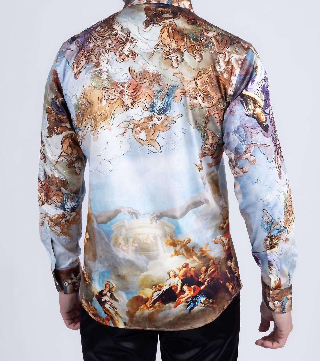 The Marrakesh Rhinestone Long Sleeve Shirt by Barabas introduces a blend of sophistication and contemporary design. Crafted from a 97% Cotton and 3% Spandex composition, this shirt offers a comfortable, slim fit perfect for any holiday party. Its long sleeves are adorned with a hand-placed Baroque rhinestone design, complemented by a unique geometric and angel print for a striking vintage-inspired look. Closure: Button closure. Care: Dry clean only.