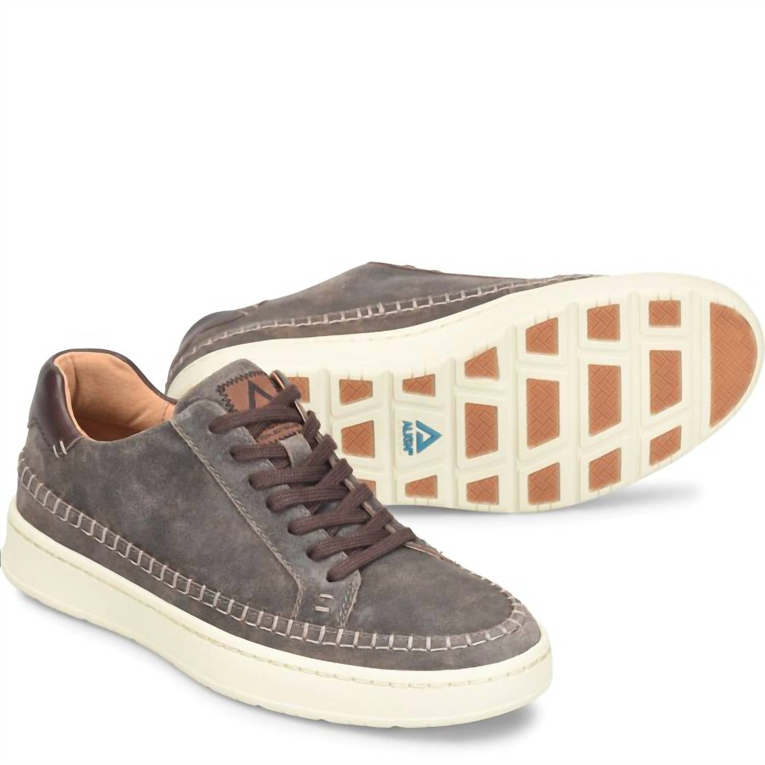 Meet the Men's Voyage Sneaker by Align, a perfect blend of comfort and style for your spring outings. This dark brown suede sneaker features a flat heel and a round toe shape, complemented with a lace-up closure for a secure fit. The leather upper and lining ensure durability, while the slip-resistant rubber sole and arch-supporting footbed with dual-density cushioning prioritize your comfort. Ideal for a Thanksgiving dinner party, these imported sneakers are designed for the maximalist trend.