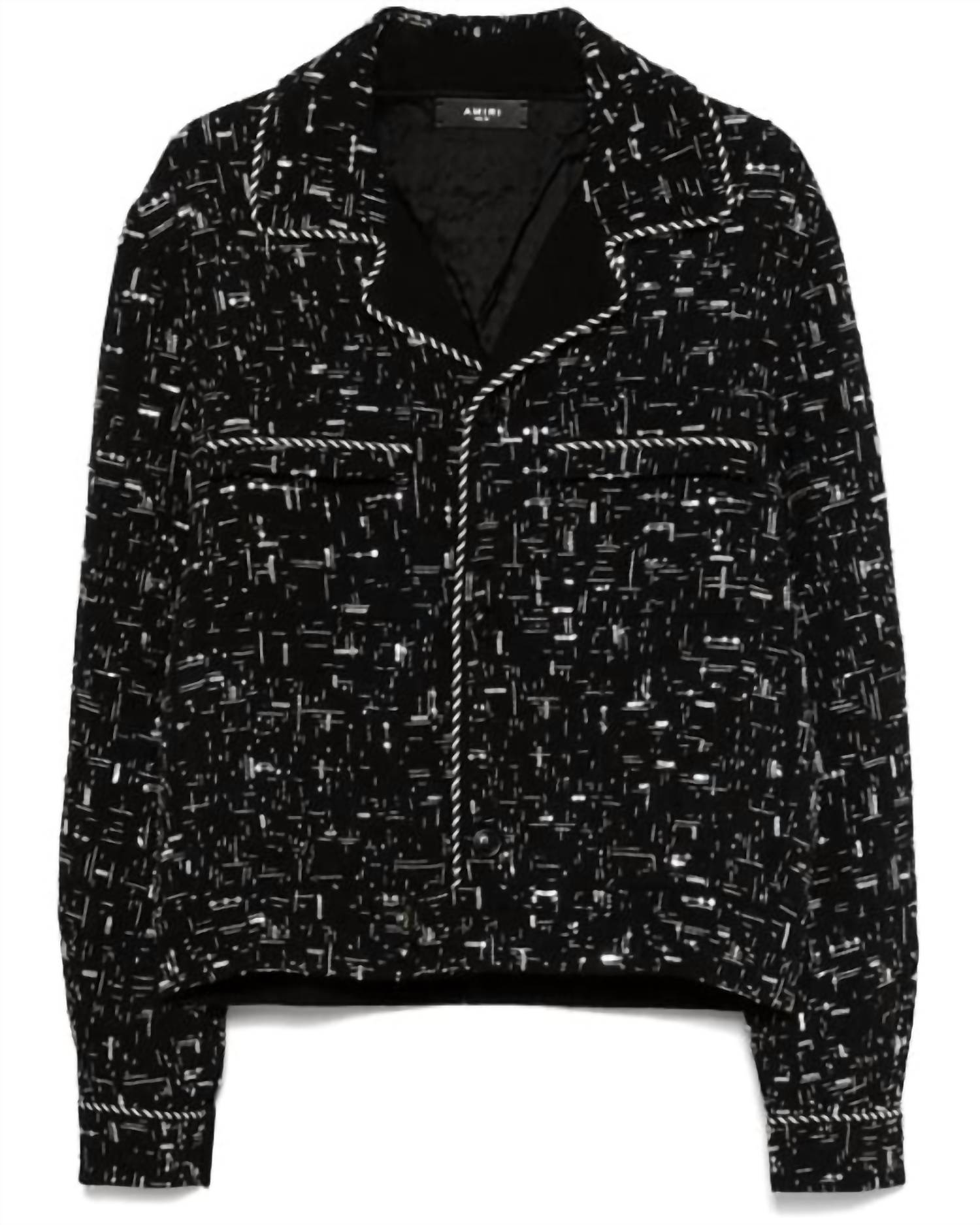 Introducing the Men's Beaded Tuxedo Jacket by Amiri, a standout piece for any evening event. This tuxedo features long sleeves and a textured design, perfect for bringing a touch of quiet luxury to a Thanksgiving gathering. Designed in classic black, it includes pockets for added functionality. A refined collar neckline completes this striking look for the fall season.