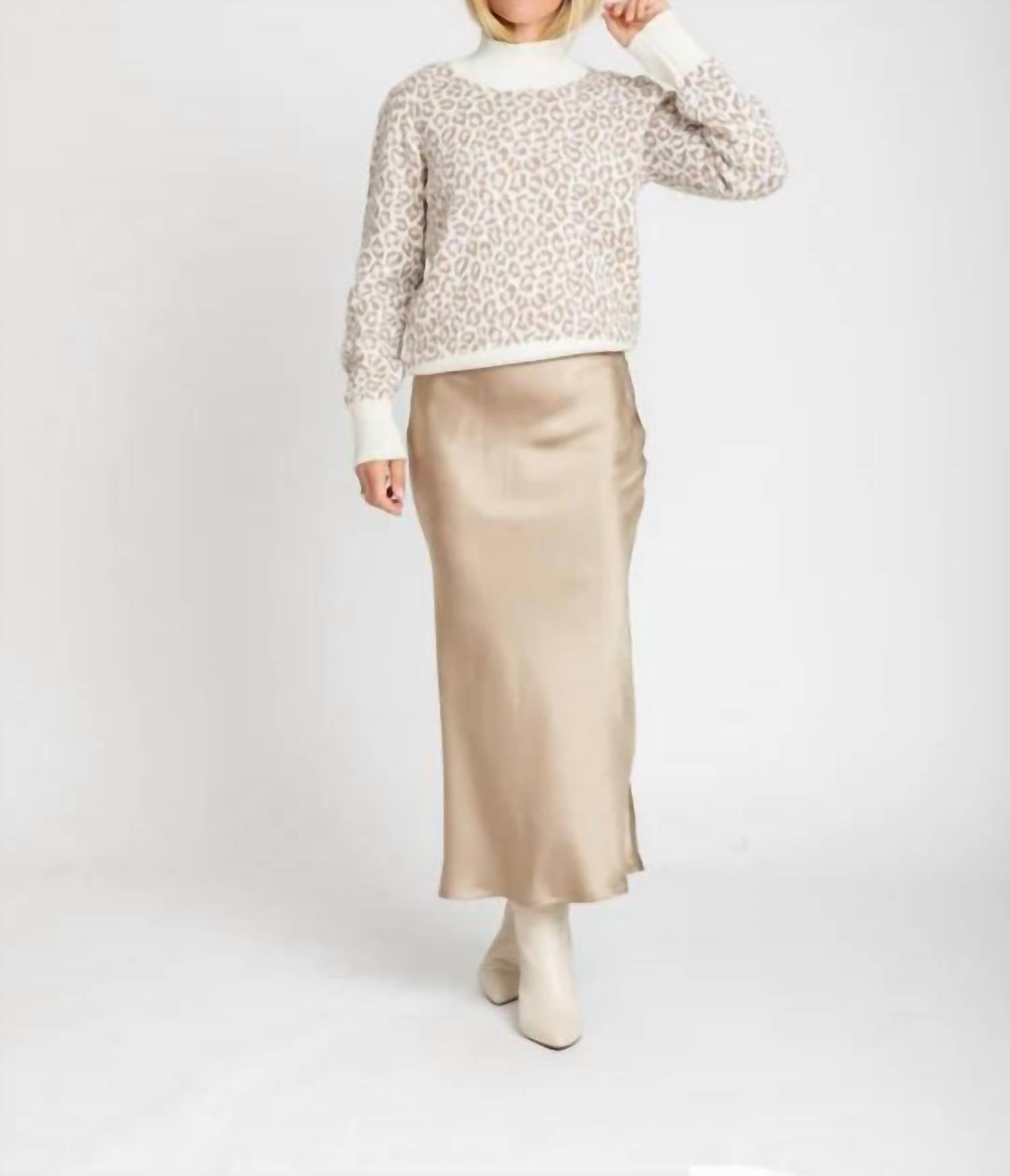 Elevate your style this season with the Vienna Turtleneck Sweater by Burgess Sweaters, featuring a chic camel and white animal print. Crafted with long sleeves in a luxurious 95% cotton and 5% cashmere blend, this women's sweater offers just the right amount of warmth. The pull-on closure ensures ease and comfort, making it perfect for a dinner party or Thanksgiving gathering. This minimalist cotton blend piece is an essential addition to your spring wardrobe.