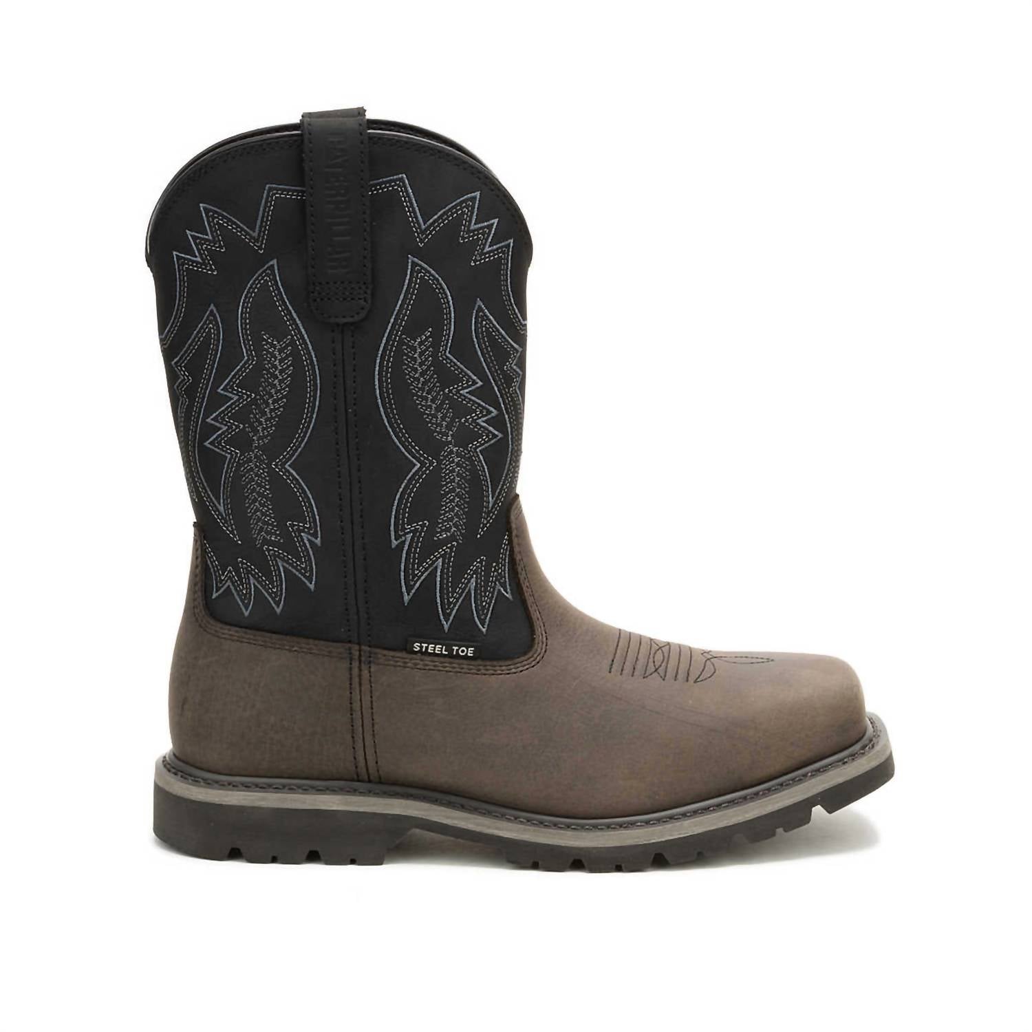 Discover the Men's Colorado Frontier Steel Toe Boot by CAT Footwear, a robust yet stylish choice in Charcoal Grey. Crafted from full-grain leather with a squared toe design, this western boot ensures protection with its steel toe meeting ASTM F2413-24 standards. The durable Goodyear Welt construction and luggy rubber outsole offer superb traction, while the foam footbed provides underfoot comfort. Featuring slip-resistant and electrical hazard protection, this medium-width boot is perfect for fall vacations and everyday wear.