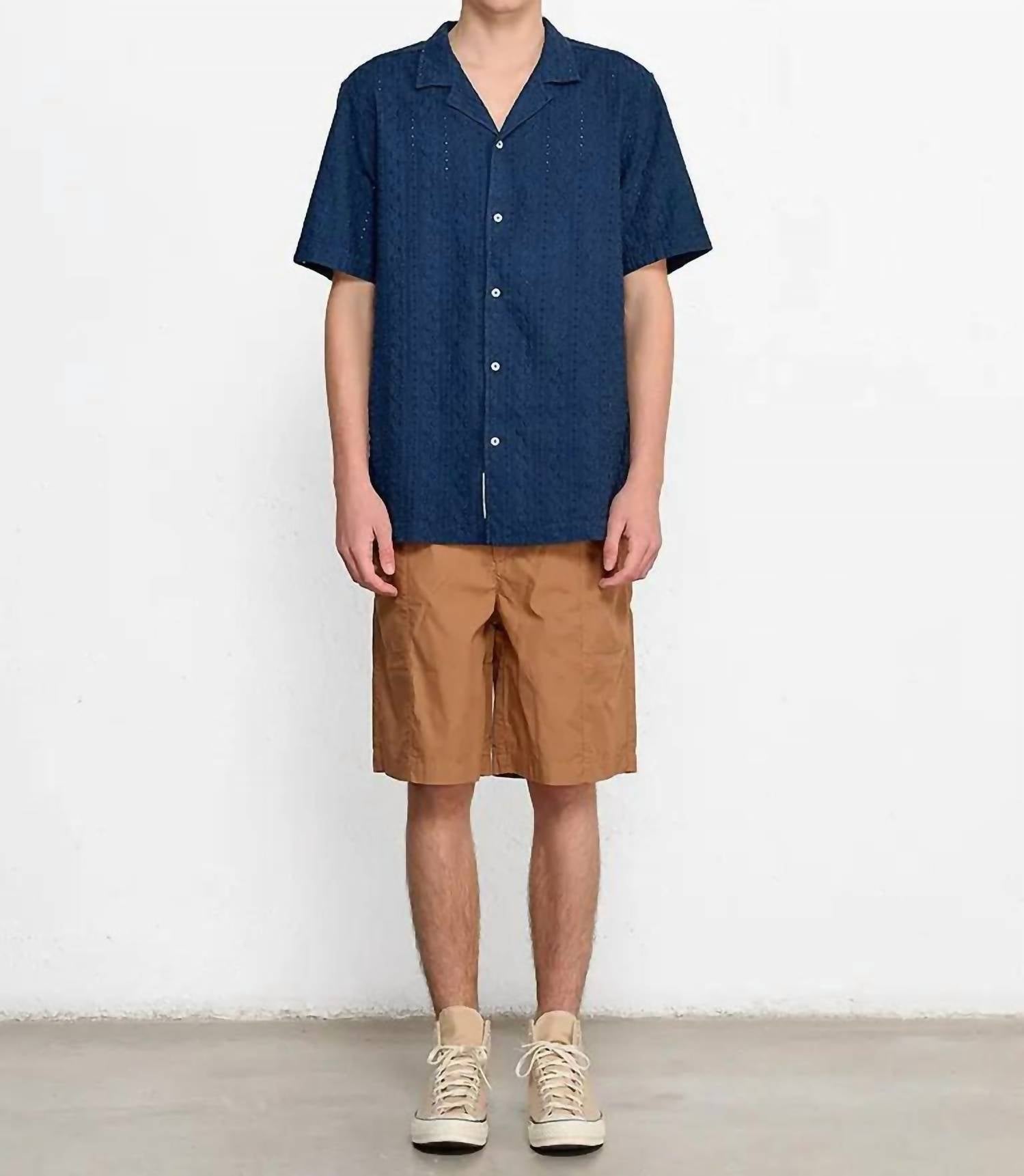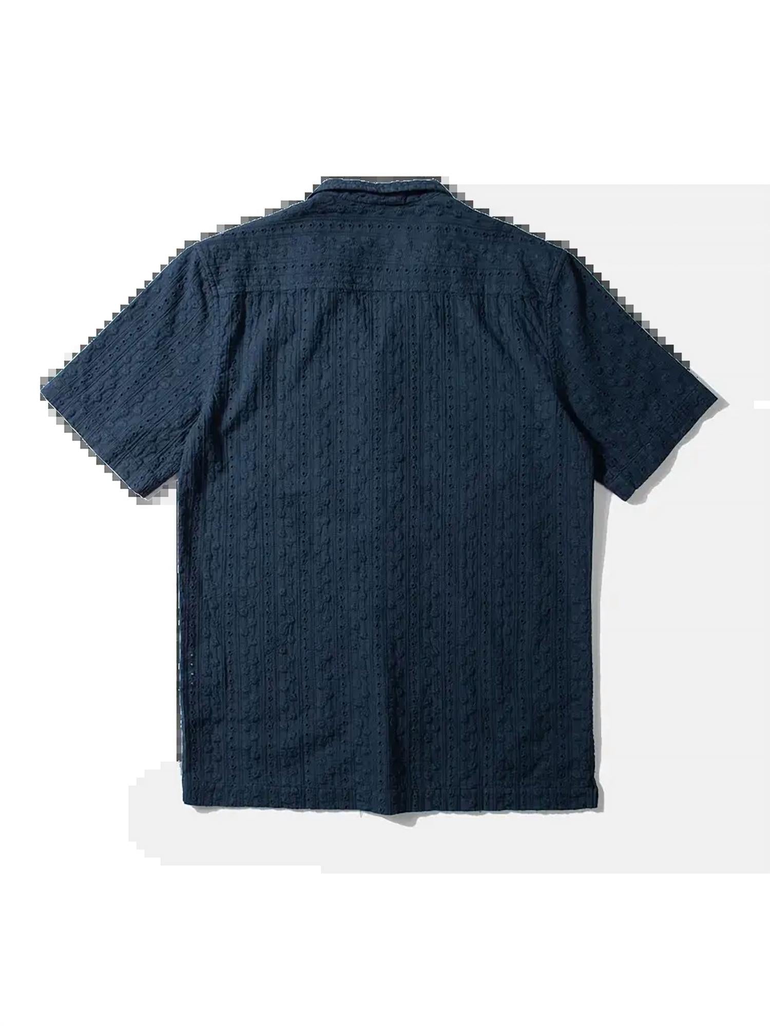 Discover the Freedom Short Sleeve Shirt by Edmmond Studios, crafted for style and comfort in a textured navy finish. This men's tee features short sleeves and a classic collar with delicate embroidery, made from 100% cotton. Originating from Portugal, it includes a convenient front button closure. It's perfect for a modern streetwear look, ideal for the back-to-school season.