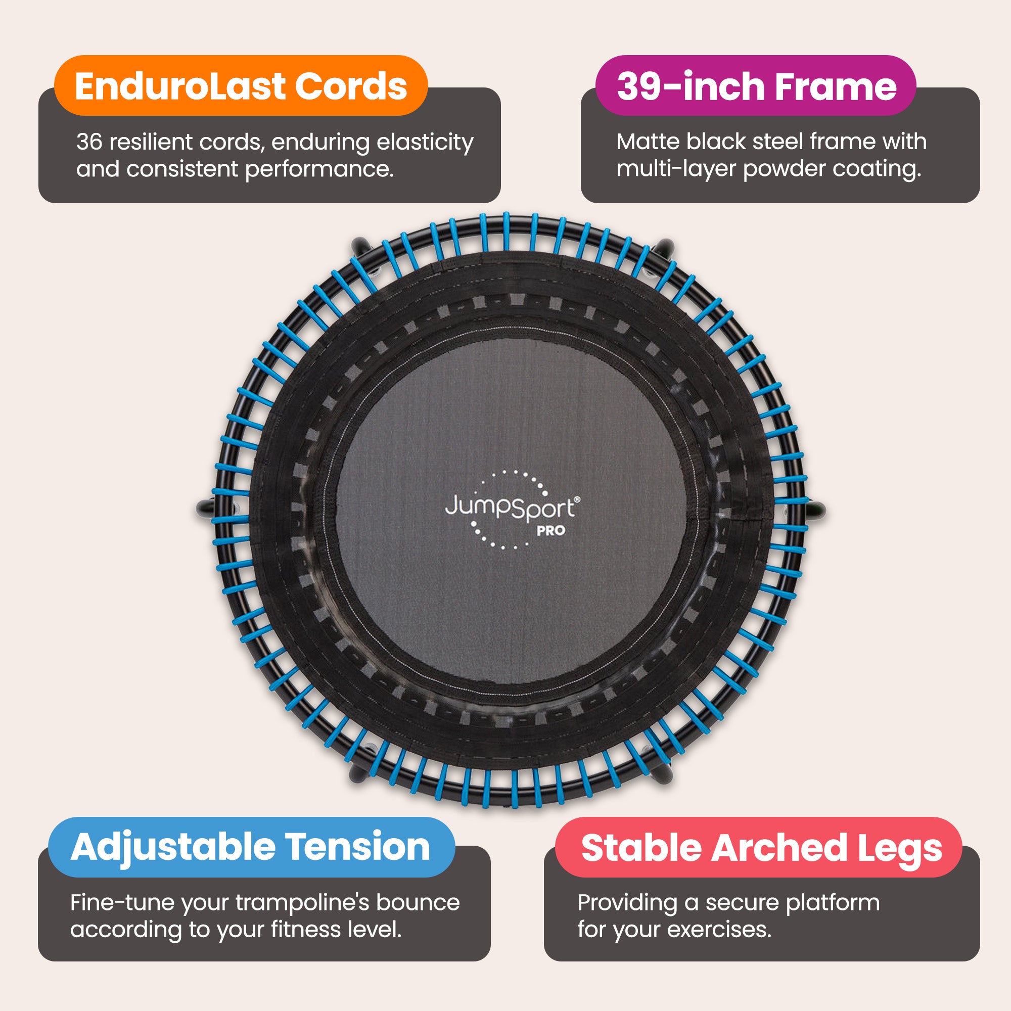 Descubra o auge dos trampolins fitness com o trampolim fitness JumpSport 350 PRO de 39 polegadas com cordas elásticas EnduroLast azuis.