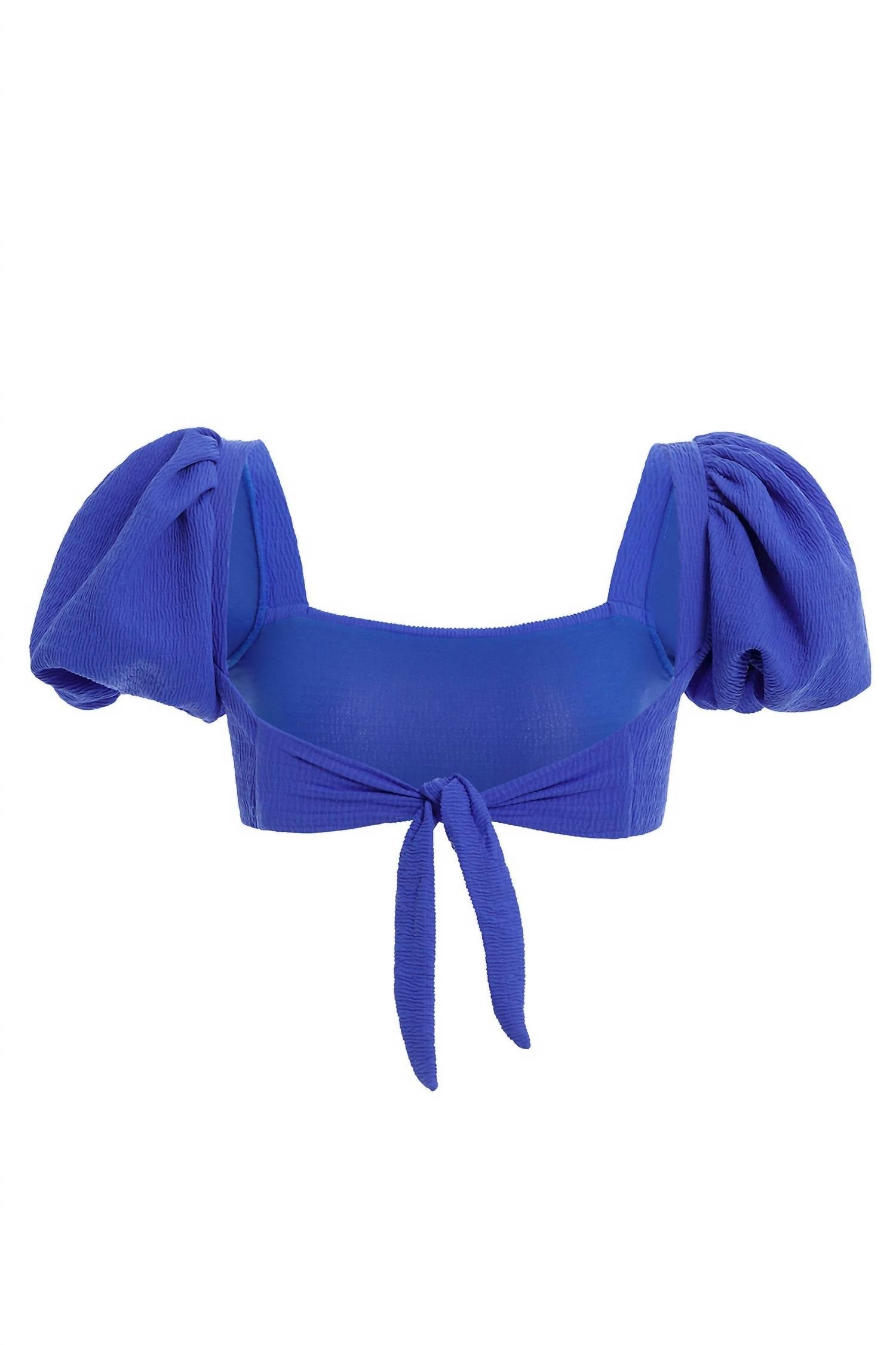 Dive into summer with the AGUA BENDITA Calista Swimsuit Bikini Top, a sleek nautical blue piece designed for both style and comfort. This swim top features oversized puffy balloon sleeves and a knot tie back for an adjustable fit, perfect for a beach day look. Crafted from luxurious nylon, it offers a classic silhouette with a supportive underband, adjustable straps, and a minimalist solid pattern. Care: Machine wash and line dry.
