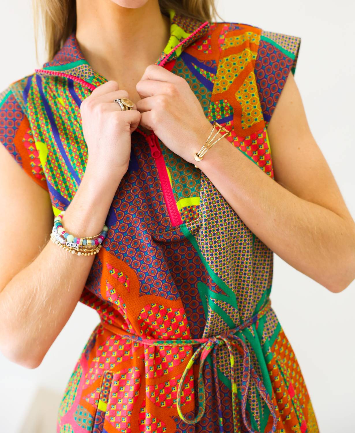A short and breezy dress for those warmer days. Elevate your style with the Alden Adair Leigh Dress, a striking sleeveless mini dress designed for both comfort and flair. Sporting a shift silhouette, it features a vibrant floral geometric pattern and a tie cinch waist for the perfect adjustable fit. Adorned with a classic collar and button closure, it seamlessly blends boho chic vibes with modern elegance. Crafted in a multi-color palette, this dress is machine washable, making it an effortless summer staple for any vacation adventure.