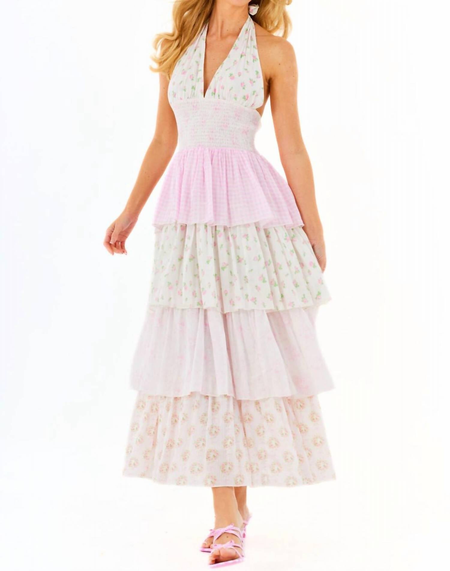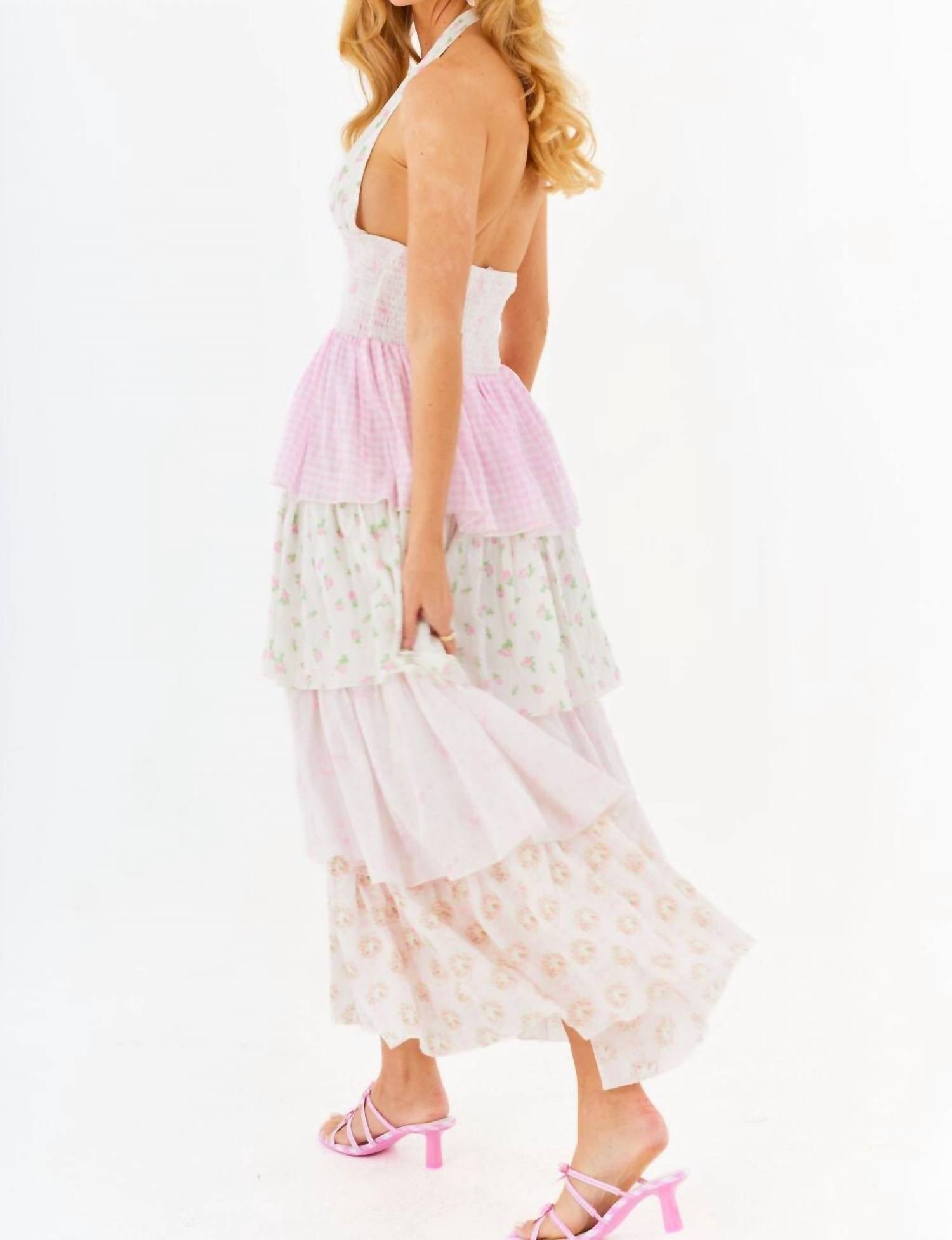 Introducing the Bonnie Maxi Dress by Amy Jane London, an effortlessly chic piece perfect for any holiday party. This pastel pink mix dress boasts a sleeveless design with a flattering fit and flare silhouette. Crafted from 100% cotton, it features a pull-on closure for ease and comfort. Care for this beautiful piece by hand washing with a cool iron and line drying. Model Brae wears a size small at 5'7" with measurements 34" bust, 25" waist, and 35" hips.