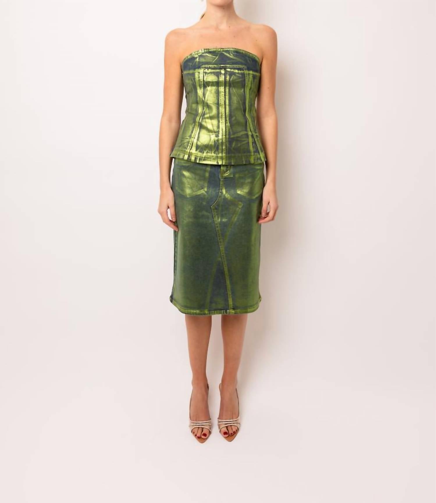 Show off just the right amount of skin in this beautifuly designed midi length skirt. Elevate your wardrobe with the Denim Foil Coated Skirt by AMYLYNN, designed for both day and night wear. This midi skirt is crafted from a stretch denim cotton blend composed of 70% cotton, 27.6% polyester, and 2.4% elastane, offering a luxe feel in a patterned green hue. Featuring a rear cut-out split and convenient pockets, it fastens with a front zip closure. Care for this piece as directed to maintain its stylish appeal.