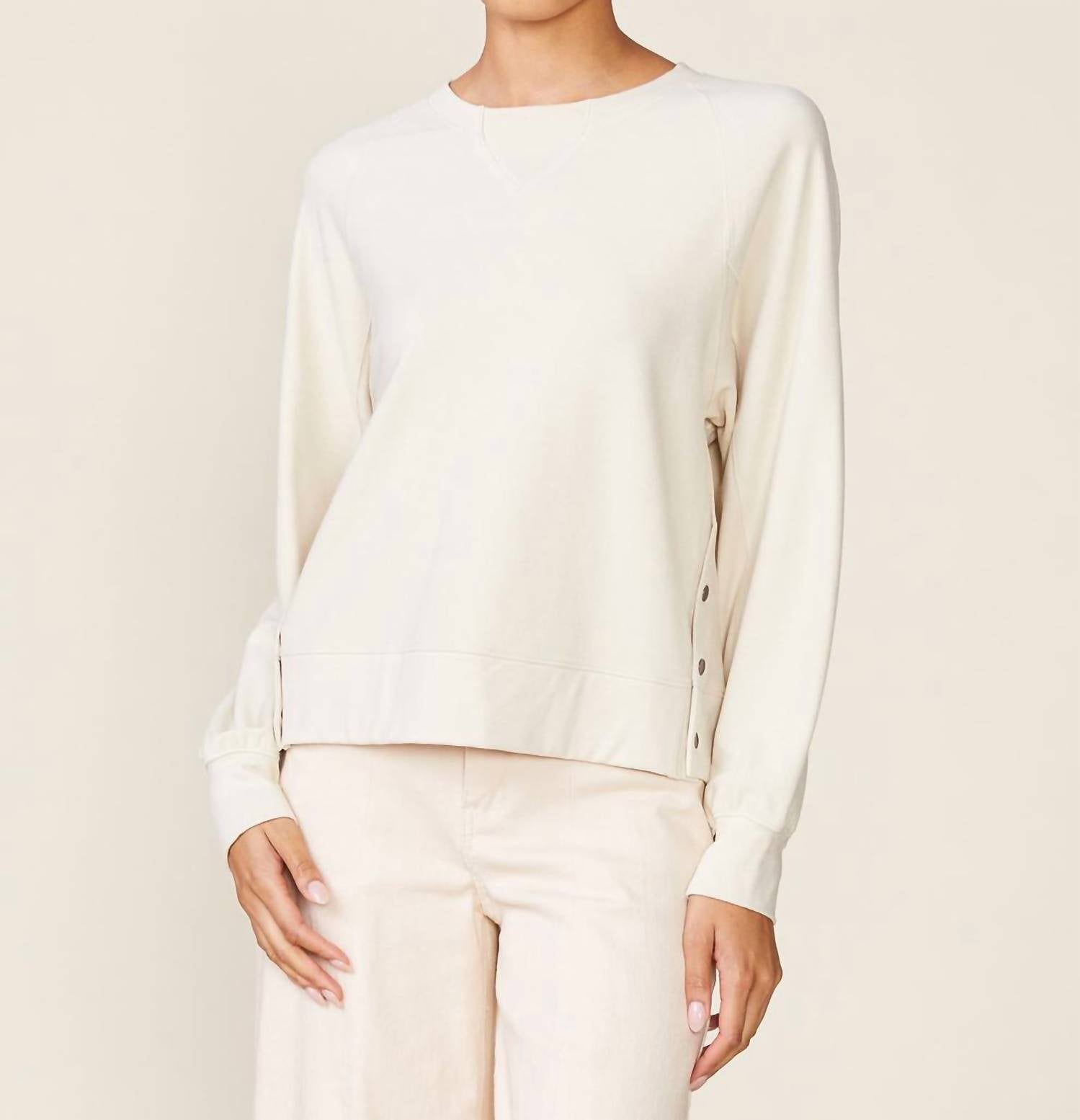 Great fit, cute design, soft fabric. You'll love everything about this long sleeve tee. Enhance your wardrobe with the Raglan Pullover With Side Snaps Top by Anthem the Label, perfect for a minimalist fall look. This almond-colored, long-sleeve pullover features a crewneck design, making it ideal for Thanksgiving or a vacation. Crafted with a solid pattern, it offers a stylish yet relaxed vibe. For maintenance, simply machine wash and line dry.