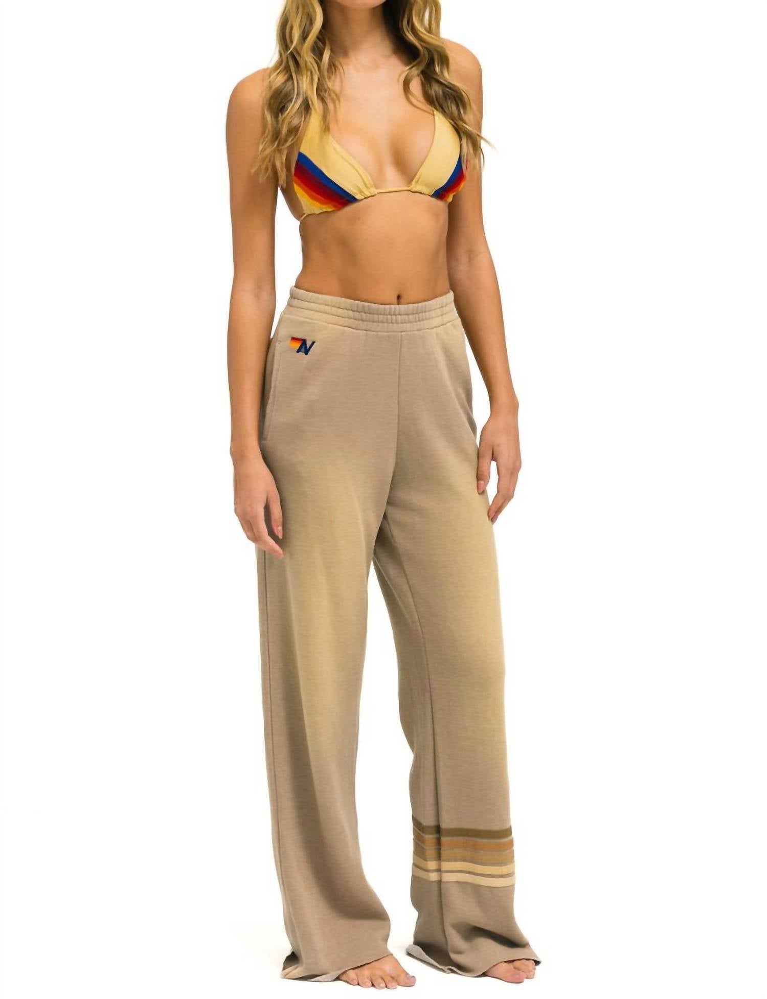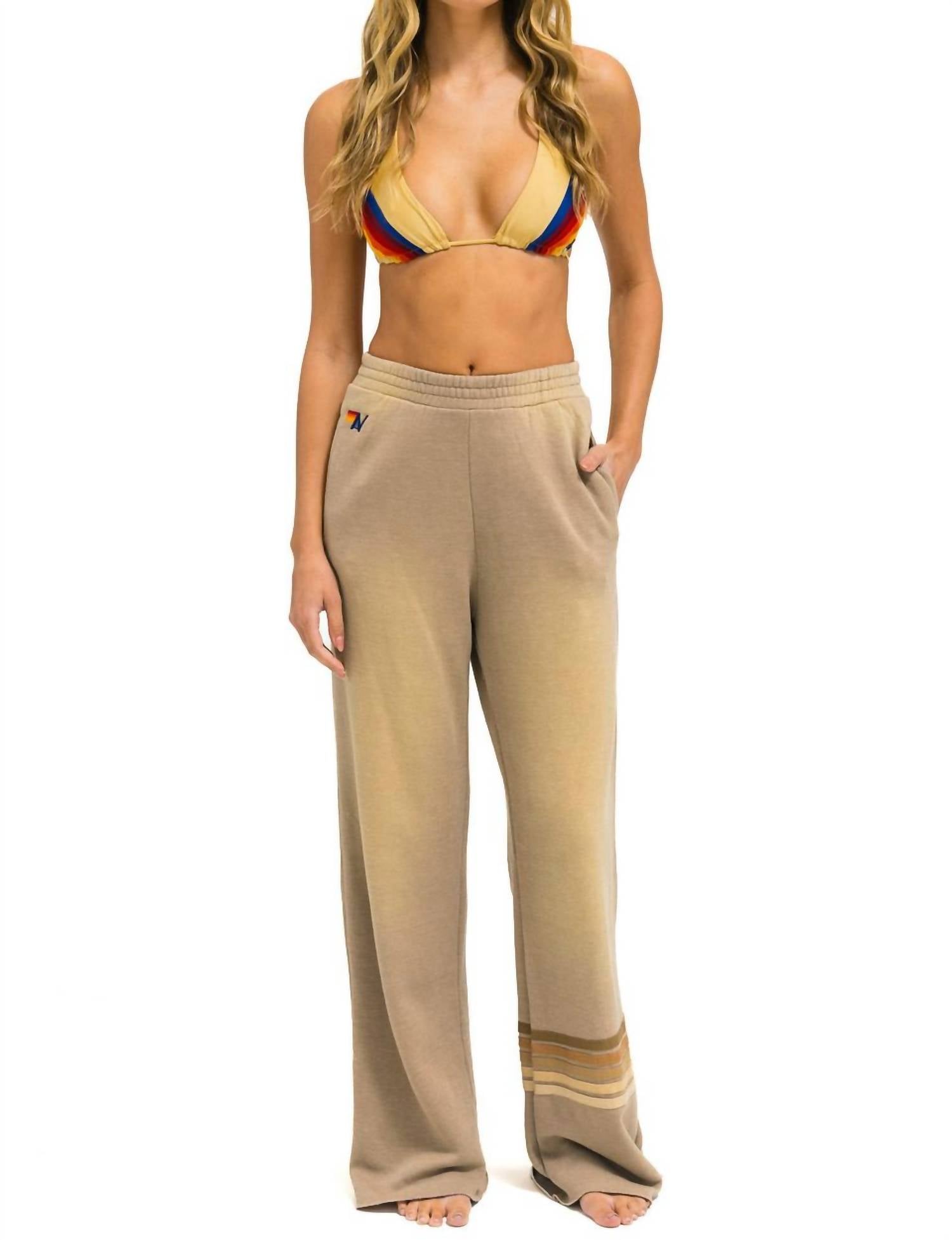 A straightleg pant that workes season after season. Dress these up with your favorite blouse or keep it casual with your go-to tee. Experience the iconic comfort of AVIATOR NATION with the Rugby Stitch Wide Leg Pocket Sweatpant in Vintage White/Brown. These women's solid, relaxed fit sweatpants feature a straight leg style with convenient pockets and pull-on closure for effortless wear. Expertly hand sewn in Los Angeles from a tri-blend of 50% polyester, 38% cotton, and 12% rayon, these sweatpants offer a unique vintage feel that's perfect for streetwear, vacation, and summer occasions. Enjoy the easy care of machine wash and tumble dry maintenance, making them a practical and stylish addition to your wardrobe.