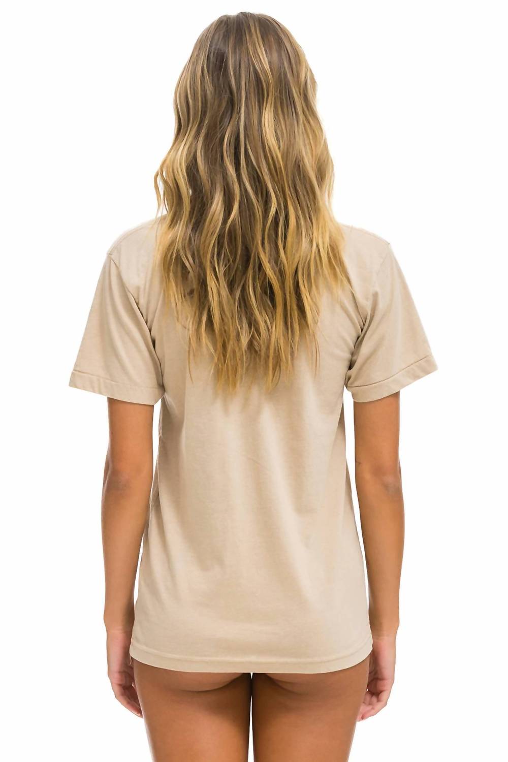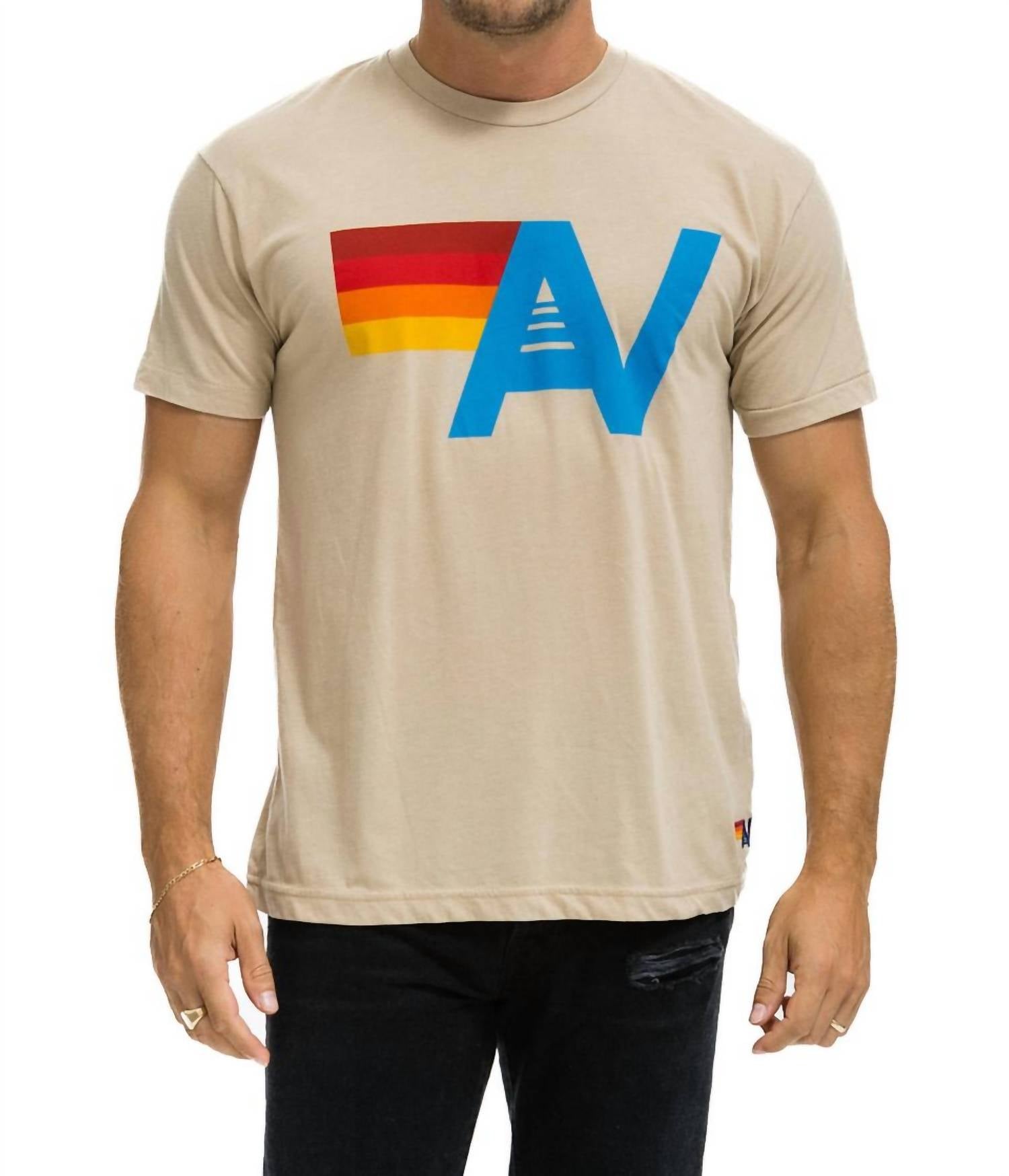 Introducing the Aviator Nation Unisex Logo Tee in a sophisticated sand hue, perfect for any Summer gathering. With short sleeves and a classic crewneck, this tee is crafted from a tri-blend fabric composed of 50% polyester, 38% cotton, and 12% rayon. Featuring a pull-on closure, it is hand-sewn in their Los Angeles factory, embodying quality craftsmanship. Care is simple; machine wash cold with like colors, and for longevity, line dry or tumble dry on low.