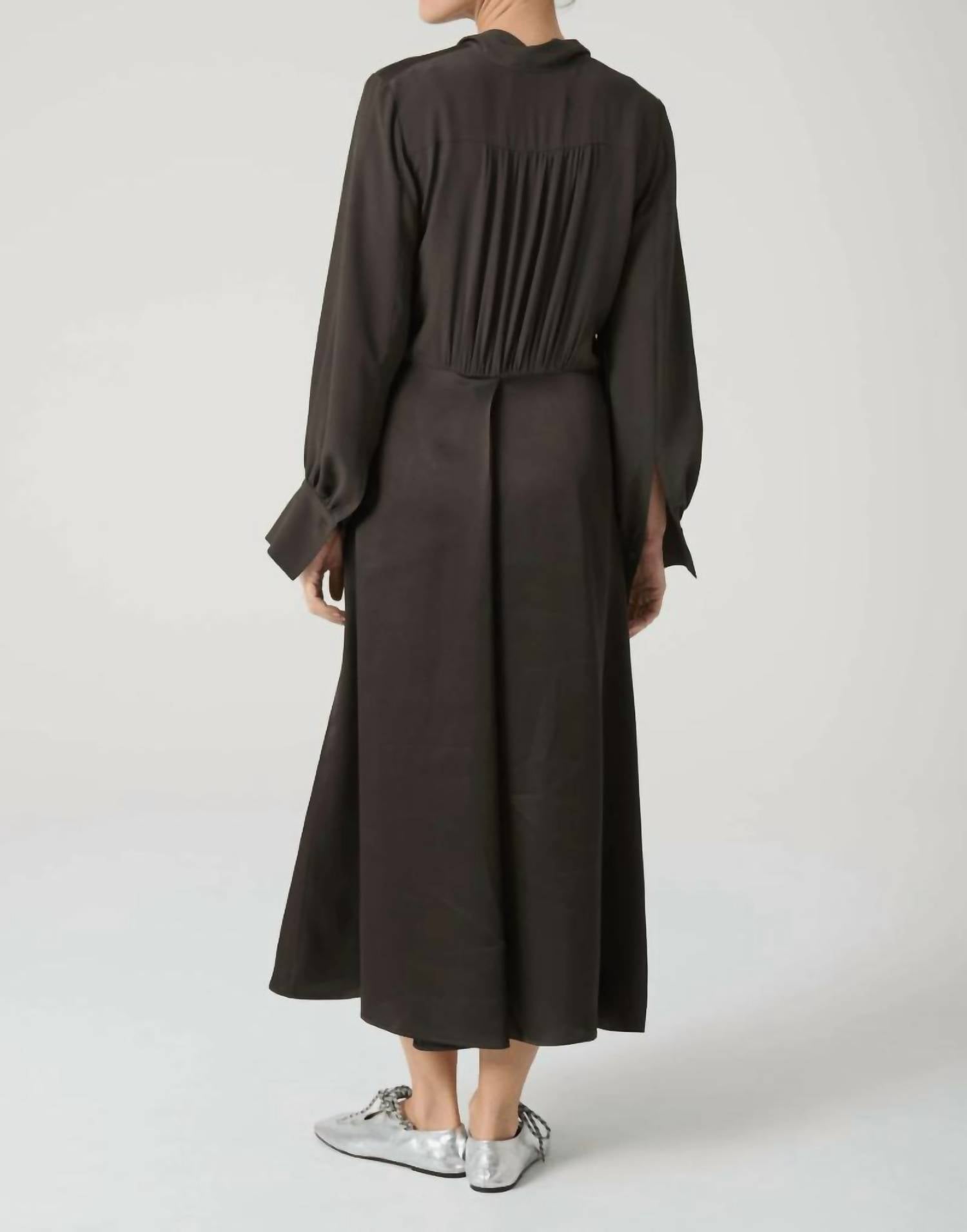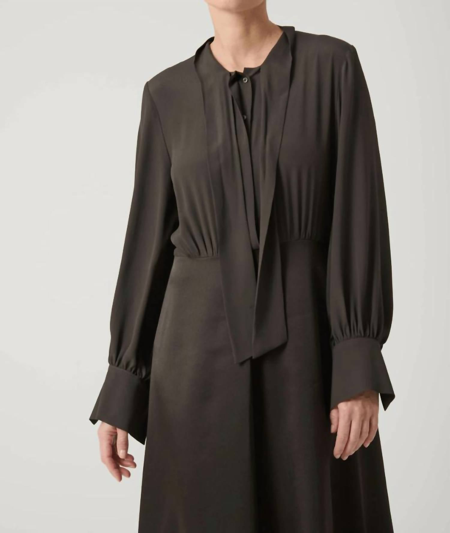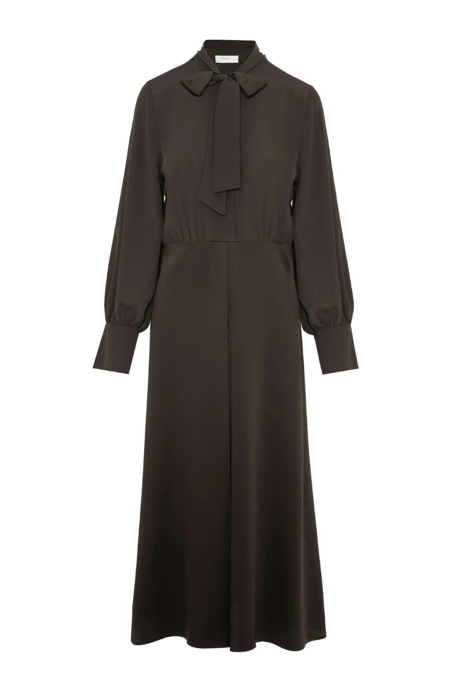 Presenting the Flared With Scarf Midi Dress by Beatrice .b in a striking brown hue, perfect for a minimalist holiday party look. This Italian-made dress combines long wide sleeves with cuffs and a silk acetate top, featuring a scarf neck detail and front button closure. The Viscose Blend material seamlessly transitions into an A-line midi skirt with a central pleat for a flattering silhouette. Ideal for Spring and Thanksgiving gatherings, this elegant dress has a pull-on closure design.