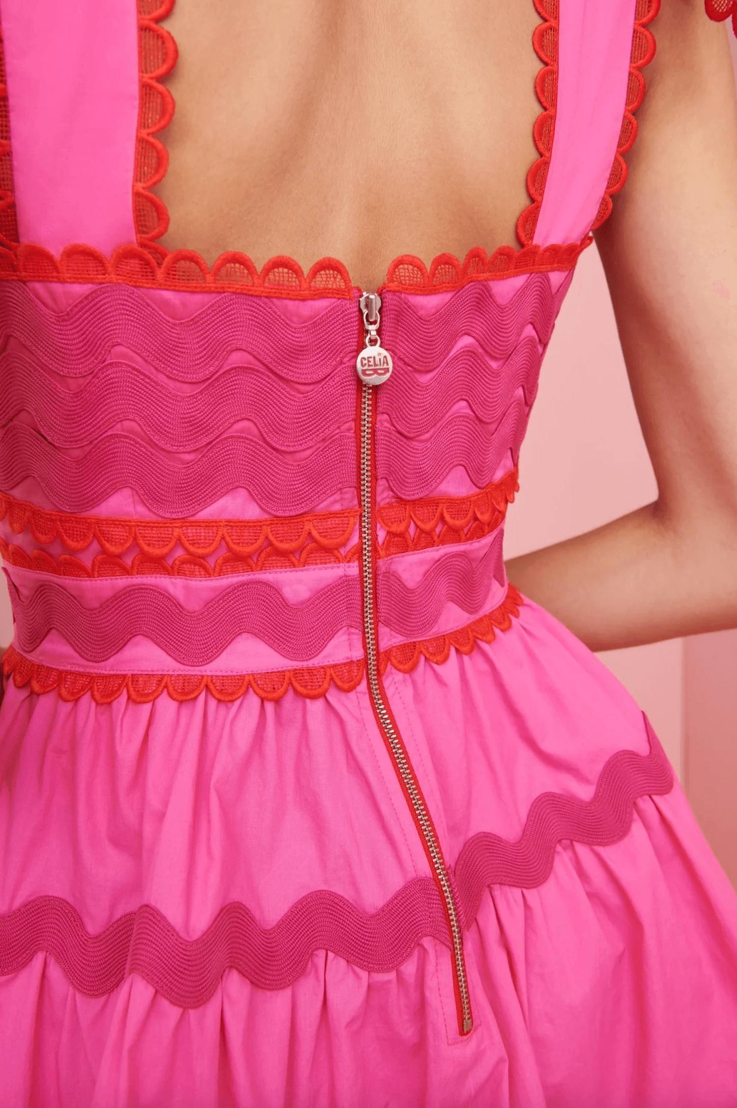 The perfect mini dress for those warmer months. Meet the Jade Mini Dress by CELiA B, a sleeveless wonder in a playful pink hue perfect for any spirited occasion. Crafted from 100% cotton with a paisley pattern, this fit and flare silhouette features red embroidered details that add charming contrast. The dress has a squareneck design and closes with a zip. Care instructions: Hand wash and line dry.