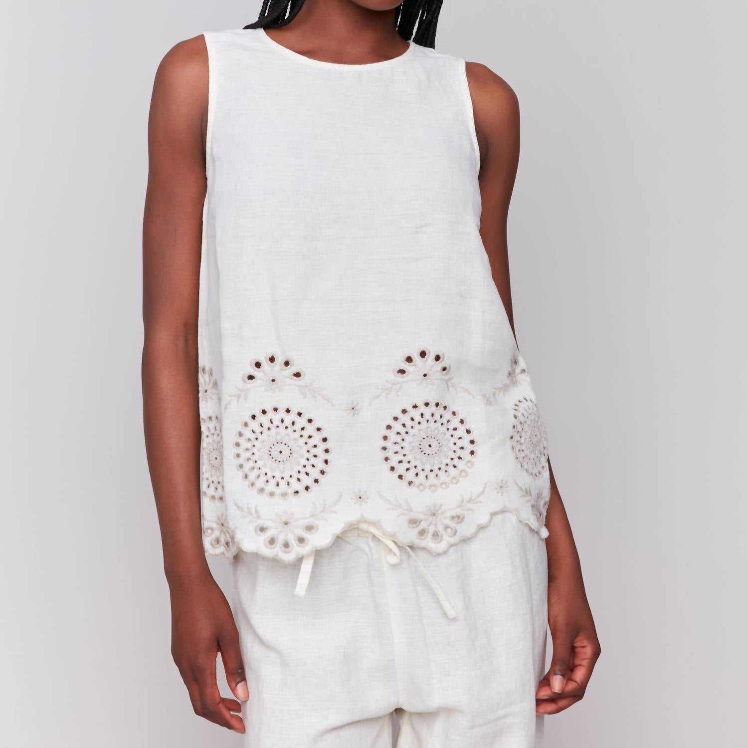 Introducing the CHARLIE B Linen Sleeveless Eyelet Embroidered Top, a chic choice for your spring gatherings. Crafted from 100% linen in a textured, natural color, this minimalist blouse offers a back length of 25 inches. Designed with a crewneck and a button closure, it effortlessly elevates your dinner party ensemble. Care for this piece by washing on a delicate cycle in cold water, using low iron settings, and line dry to maintain its elegance.