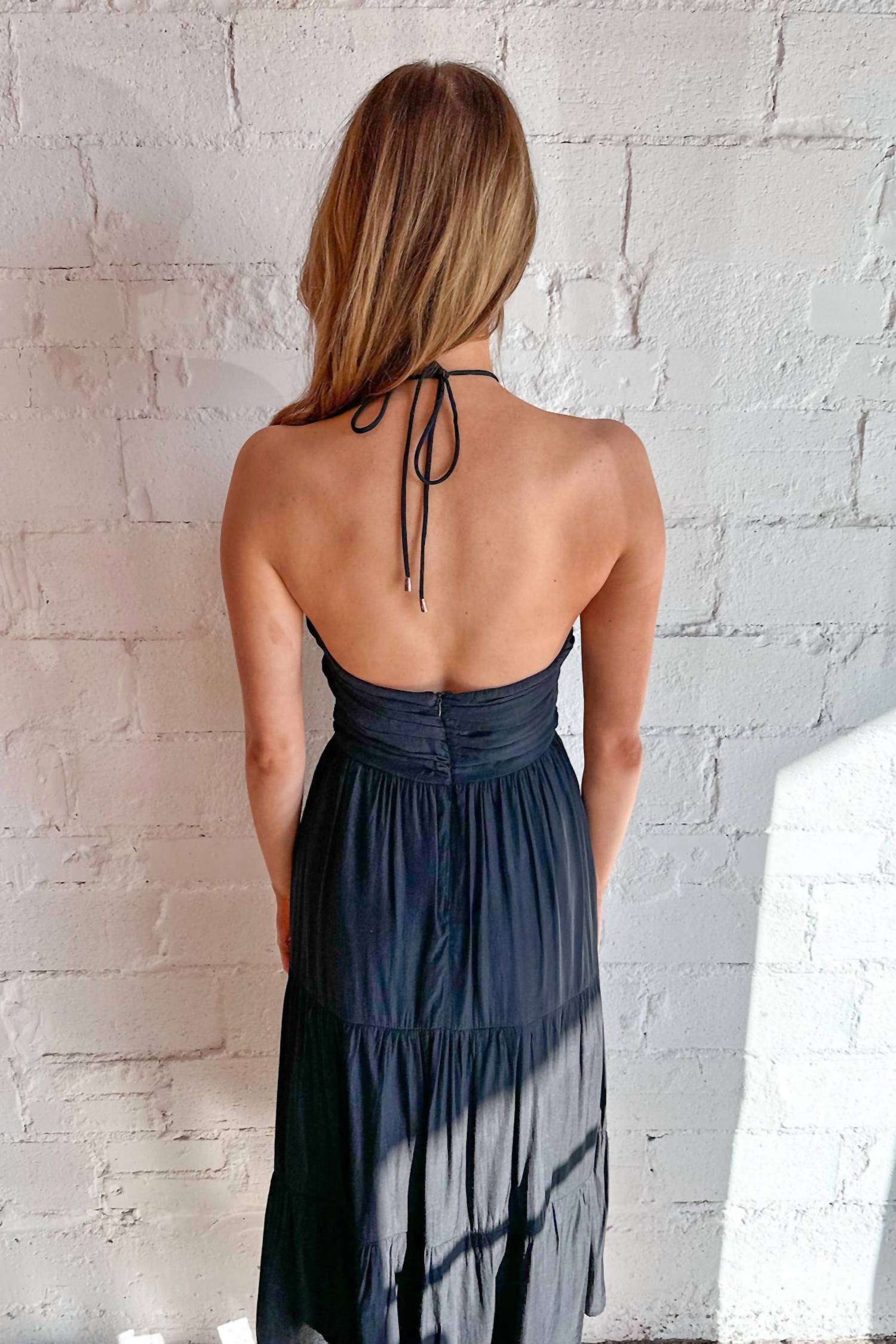 Discover the Haltered Ruched Midi Dress by Day + Moon, an elegant addition to your collection. This versatile dress features spaghetti straps and a flattering halter neckline, perfect for holiday parties in the spring, especially around Thanksgiving. Crafted from 50% Polyester and 50% Rayon, it offers an A-line silhouette with solid patterns in classic black. Closure: Zip closure. Care: Hand wash cold, line dry.