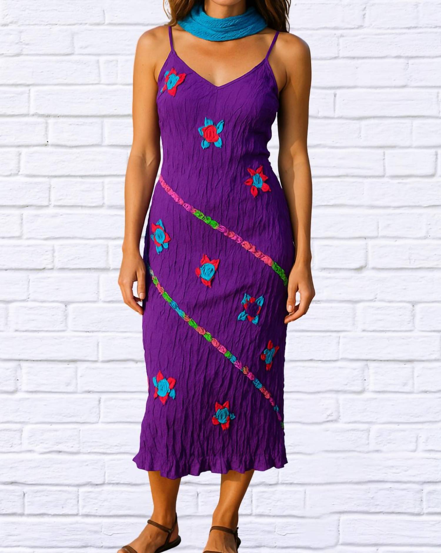 Just add slides or mules and you are good to go. Unleash your inner muse in the Sibella Crushed Dress by Diva USA, a whimsical midi dress crafted for free-spirited women. This sleeveless slip dress exhibits a unique bias-cut with spaghetti straps and is made from luxuriously soft crushed polyester, featuring a v-neck for a feminine touch. Closure is effortlessly managed with a pull-on style, and the intricate floral pattern and hand-sewn accents captivate with their artsy appeal. Care instructions suggest dry cleaning to maintain its enchanting charm.