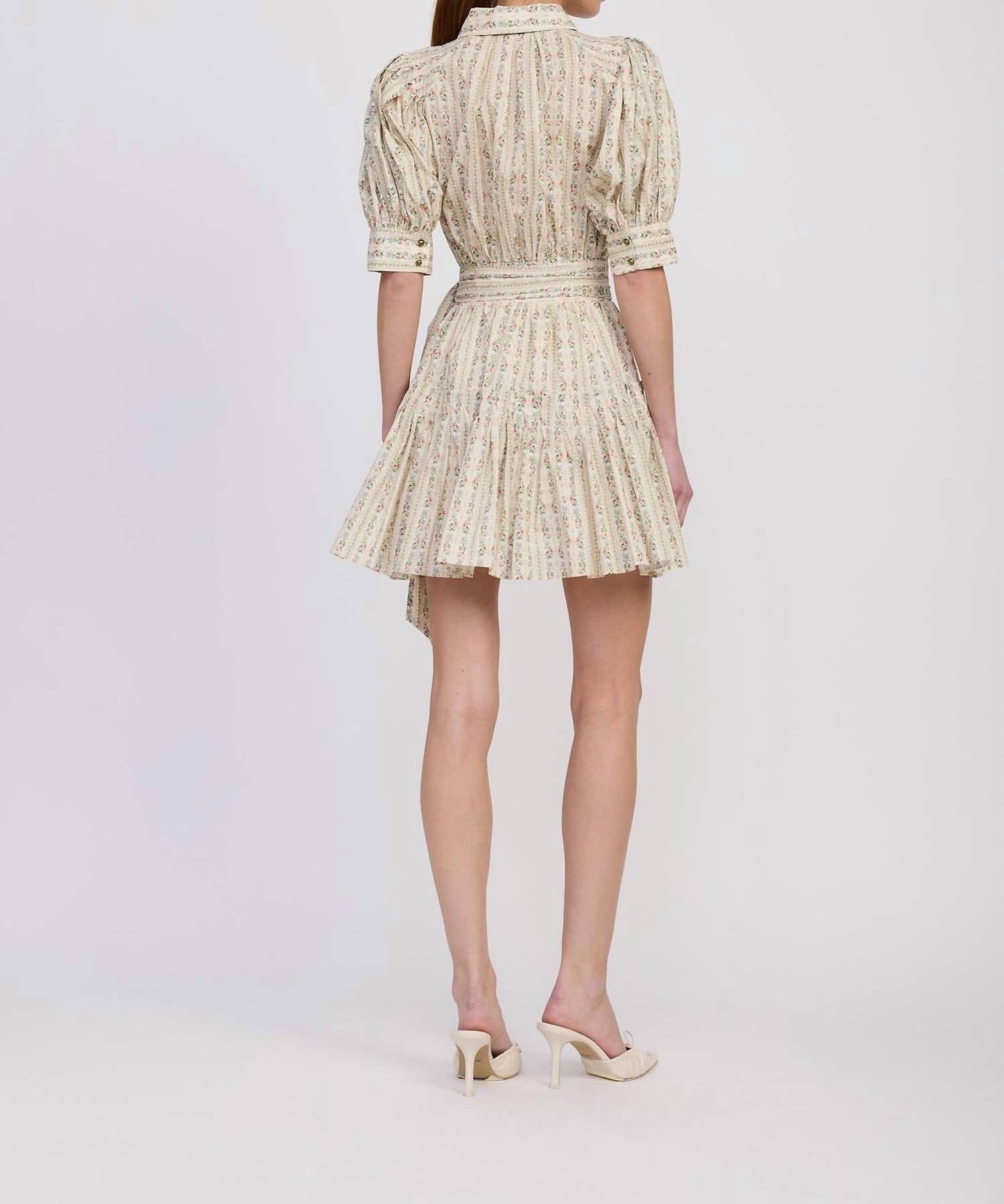 Introducing the Rosalia Mini Dress by En Saison, a chic addition to your wardrobe with elbow-length sleeves and a fit and flare silhouette. Crafted from lightweight, patterned 100% Cotton, this dress combines a classic collared neckline and a button-down front with a playful, flowy skirt. The adjustable waist tie accentuates your figure, making it a perfect choice for any occasion. Care instructions recommend hand washing to maintain its elegant style in the Ivory Olive Multi color.
