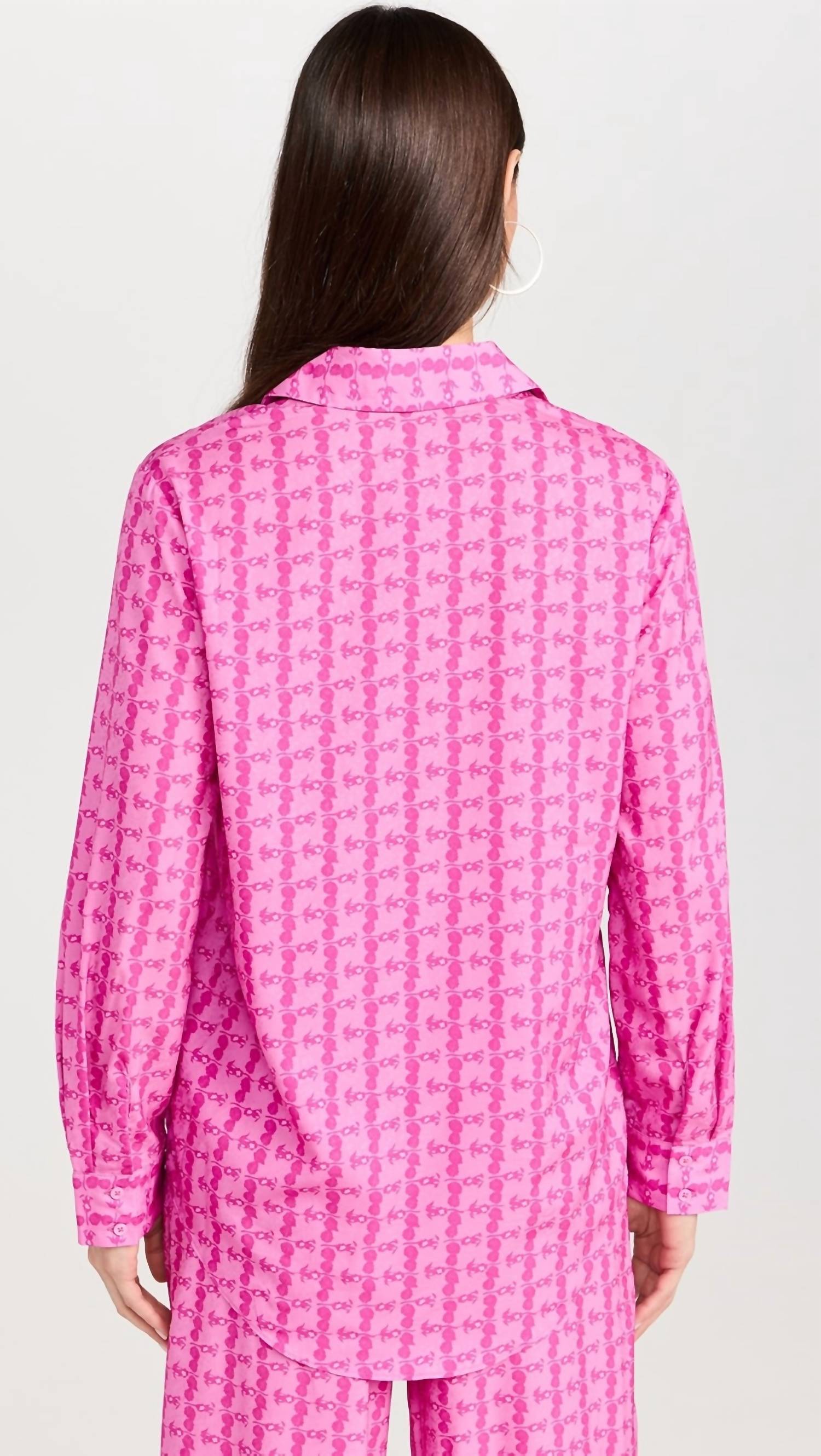 Upgrade your wardrobe with the English Factory Printed Satin Shirt in a vibrant pink pattern. Designed with long sleeves and button cuffs, this collared shirt is a chic addition to any outfit. Crafted from 100% polyester, its 26-inch length offers a sophisticated silhouette. Imported from China, it features a button closure and requires hand washing to maintain its stunning satin finish.