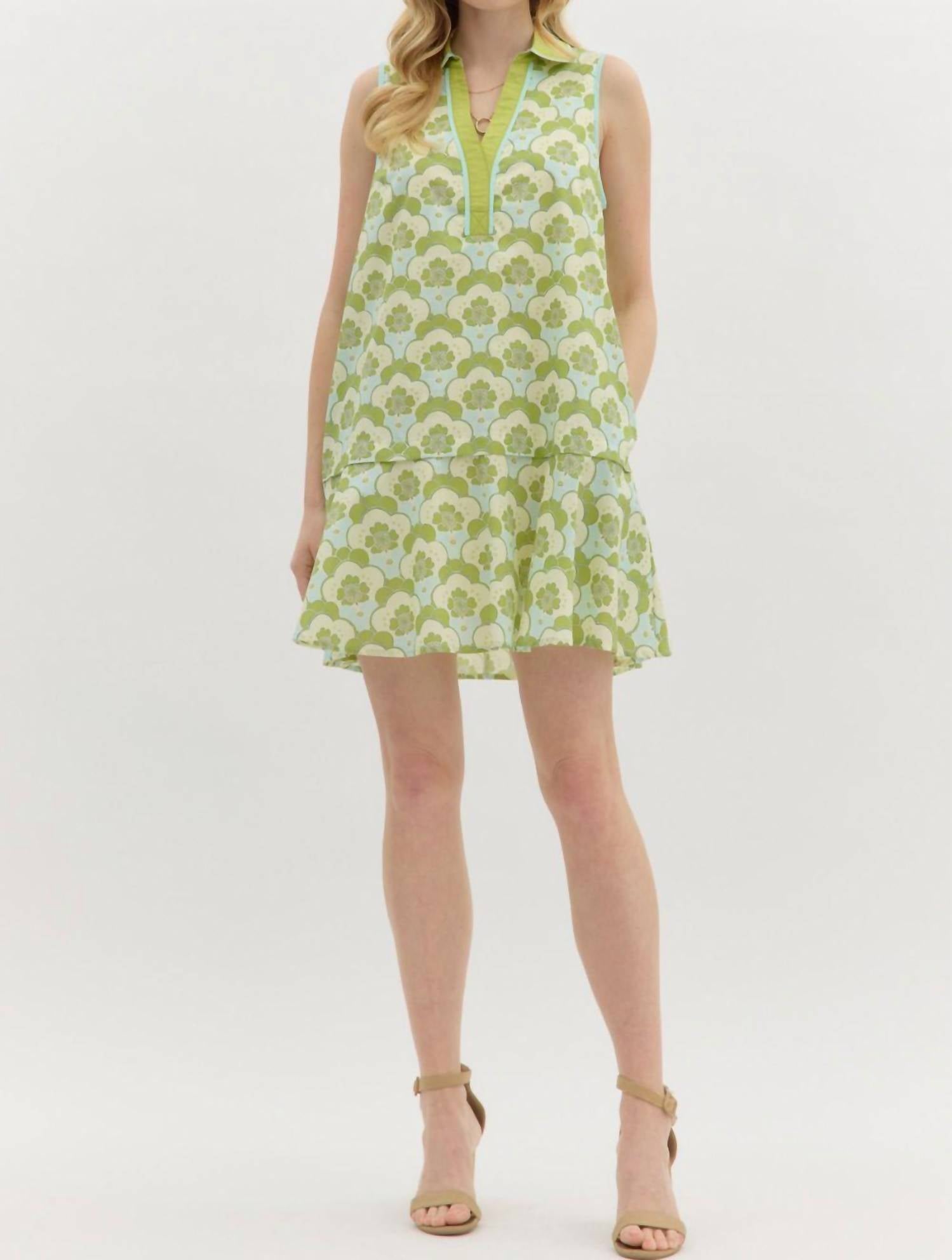 Introducing the Split Neck Abstracted Mini Dress by Entro, a chic addition to your summer wardrobe in vibrant chartreuse. This sleeveless A-line dress features an abstract print and a stylish split neck collar, with convenient side pockets. Crafted from 100% cotton, this lightweight, lined piece offers effortless pull-on wear. Care: Hand wash and line dry for best results.