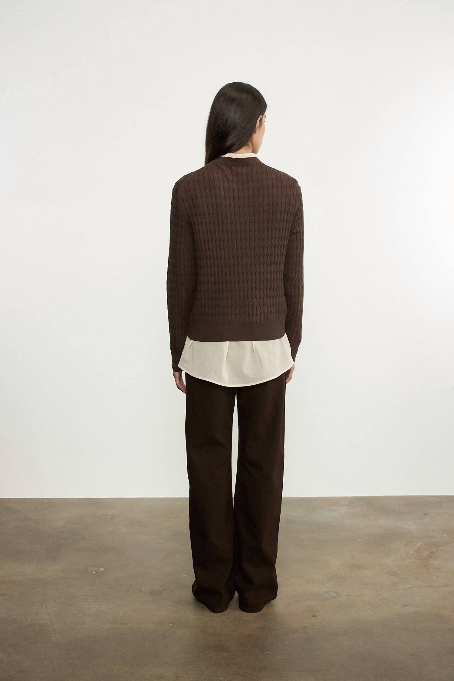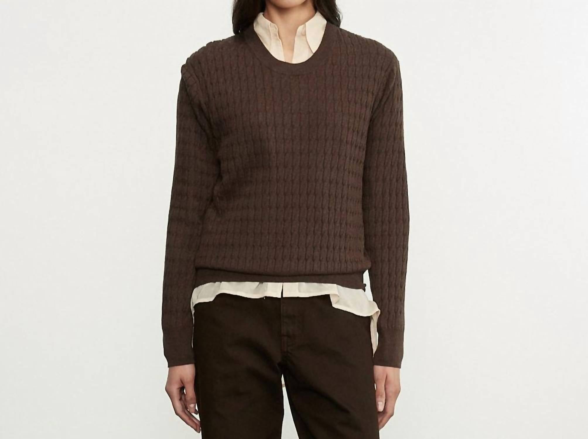 Introducing the Cable Knit Easy Crew Sweater by Enza Costa, a chic addition to your spring wardrobe in a textured brown finish. This women's crewneck sweater features long sleeves and combines the sumptuous softness of a 15% Cashmere, 85% Cotton blend. With a pull-on design, it's perfect for minimalist fashion enthusiasts and fits effortlessly into a dinner party setting. Embrace understated elegance with a style that's both comfortable and refined.