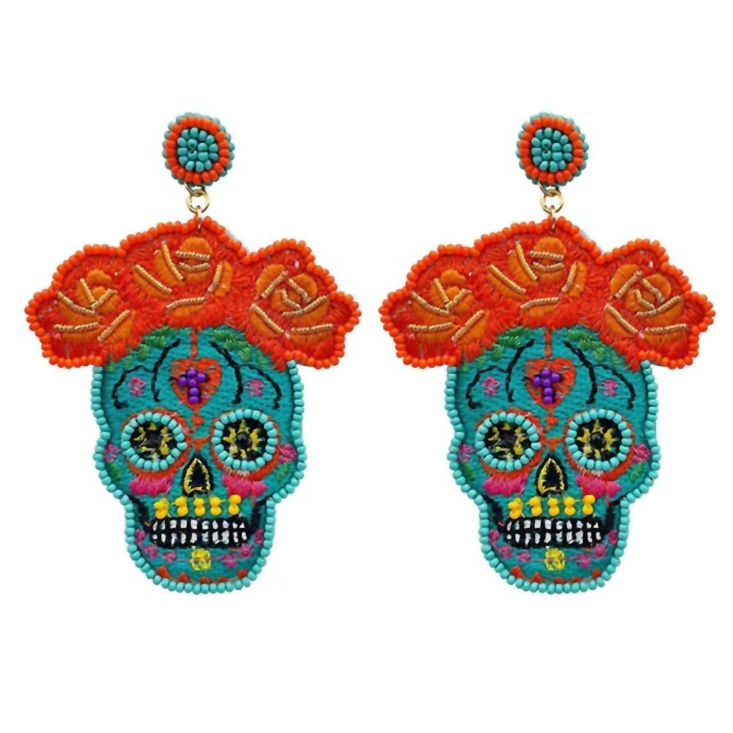 Introducing the Turquoise Beaded Sugar Skull Earrings by Fashion CITY, a perfect statement piece for adding festive flair to any outfit. These earrings are hand-crafted with colorful seed beads and floral accents, measuring approximately 3.5" in length. With their lightweight design, they are ideal for celebrating Día de los Muertos, festivals, or simply injecting a vibrant splash of color into your everyday ensemble.