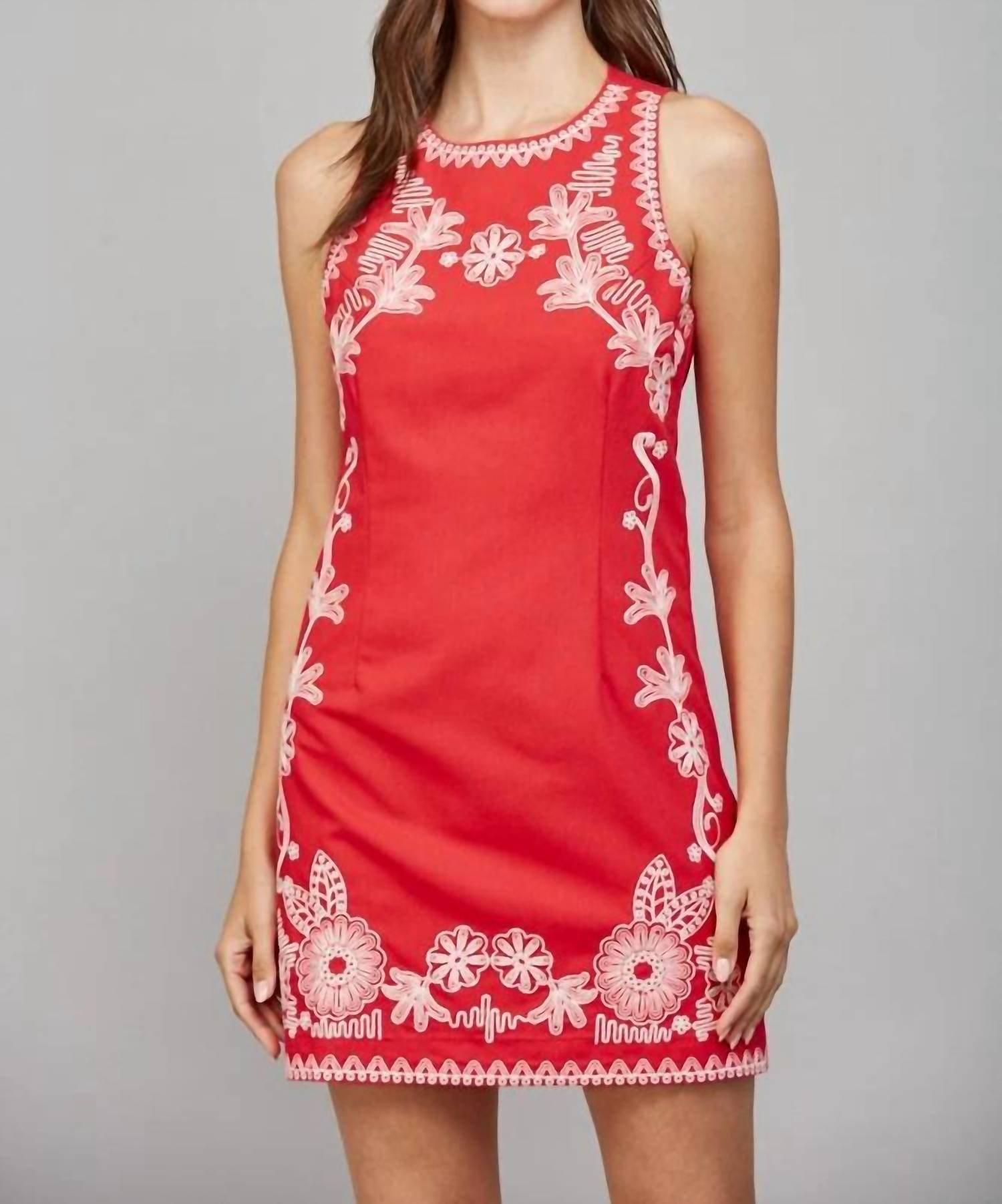 Embrace the summer with the Arden Mini Dress by Fate, a vibrant red linen shift that's perfect for sunny-day adventures. This sleeveless dress features delicate white floral embroidery, creating a striking contrast against the bold background. Composition includes 50% Cotton, 30% Linen, and 20% Polyester with a 100% Cotton lining. Designed with a fitted, above-knee silhouette and a convenient zip closure, this dress is ideal for dinner parties or casual outings.