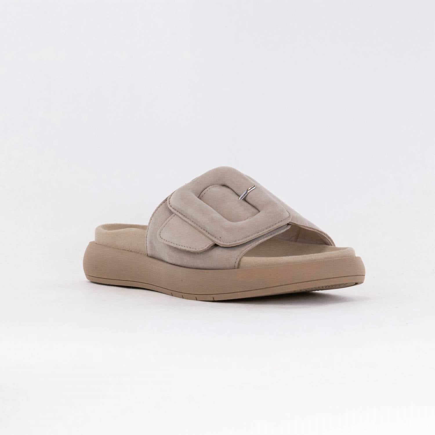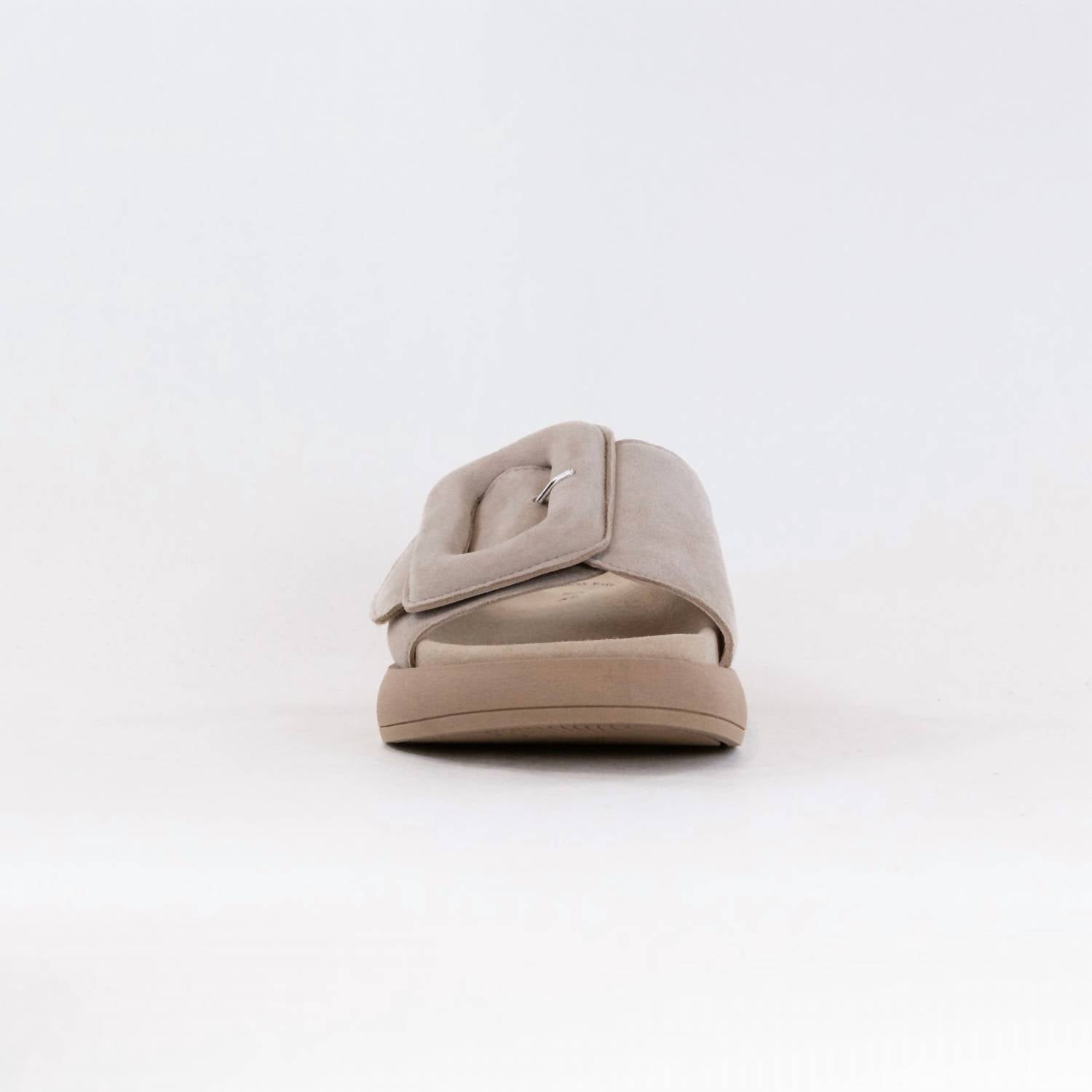 Step into comfort and style with the Women's Sandal by GABOR in Desert, a boho chic essential for your summer wardrobe. These sandals feature a unique single band faux buckle with velcro adjustability, leather linings, and a leather-covered latex padded contoured footbed. With a rubber sole supporting a 1-inch platform wedge rising to 1 1/2 inches, the sandal ensures best fitting with a medium shoe width for a flat heel height of 10mm. Expertly crafted from suede, they are ideal for vacation occasions and boast an open toe shape for a relaxed yet sophisticated look.