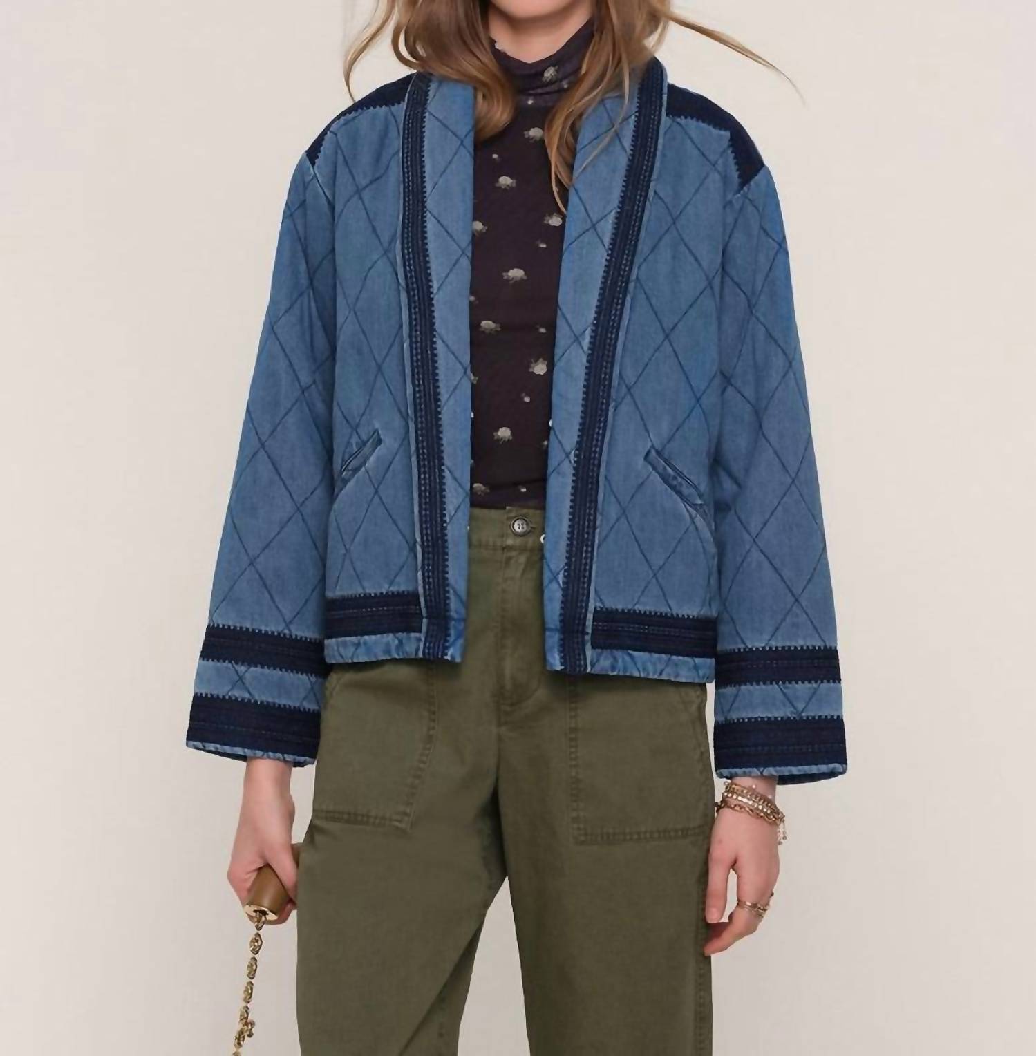 Introduce the Marel Jacket by Heartloom, an Atlantic-hued utility jacket perfect for your fall wardrobe. This standout piece features long sleeves and novelty embroidery on quilted denim for a textured effect, coupled with a shawl collar for added style. Crafted from 100% cotton, it measures 23.5" in length from the high point of the shoulder and offers a relaxed fit with practical pockets. Closure: Hook and eye. Ideal for holiday parties like Thanksgiving, this jacket effortlessly blends workwear trends with a festive flair.