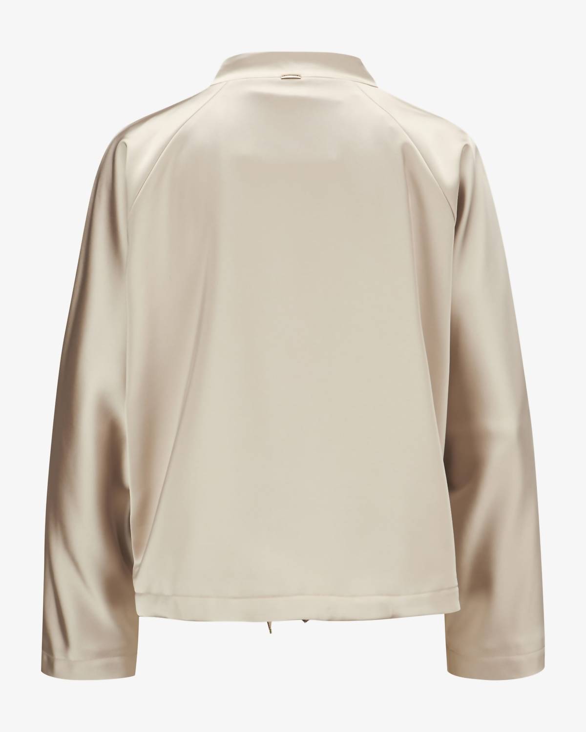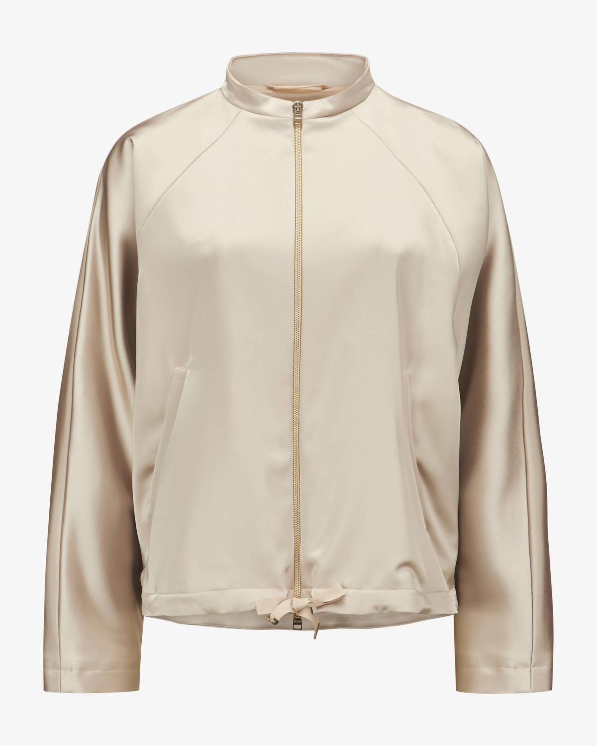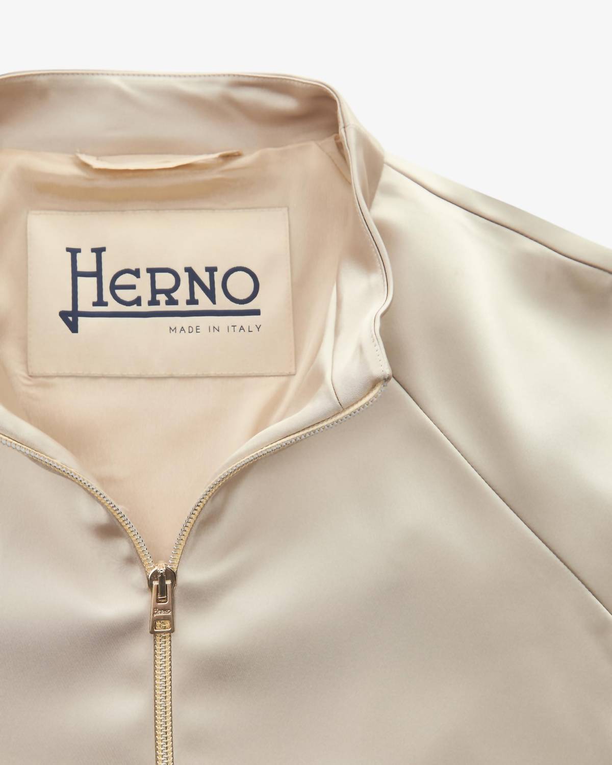 Embrace elegance with the Women's Satin Jacket With Zip by Herno in a stunning champagne hue. This oversized blouson is designed with long raglan sleeves and a chic narrow stand-up collar, accentuated by a luxurious satin finish. The two-way zip closure and practical drawstring waistband, along with two side pockets, add functionality to style. Sleeve Length: 58 cm. Care: Dry clean only.