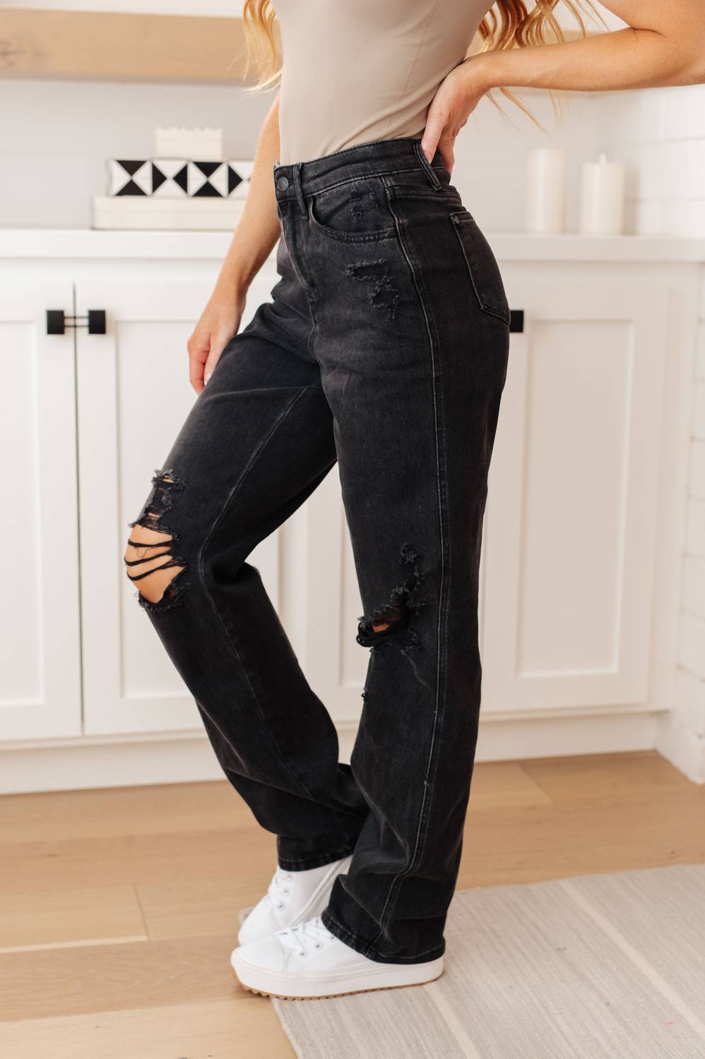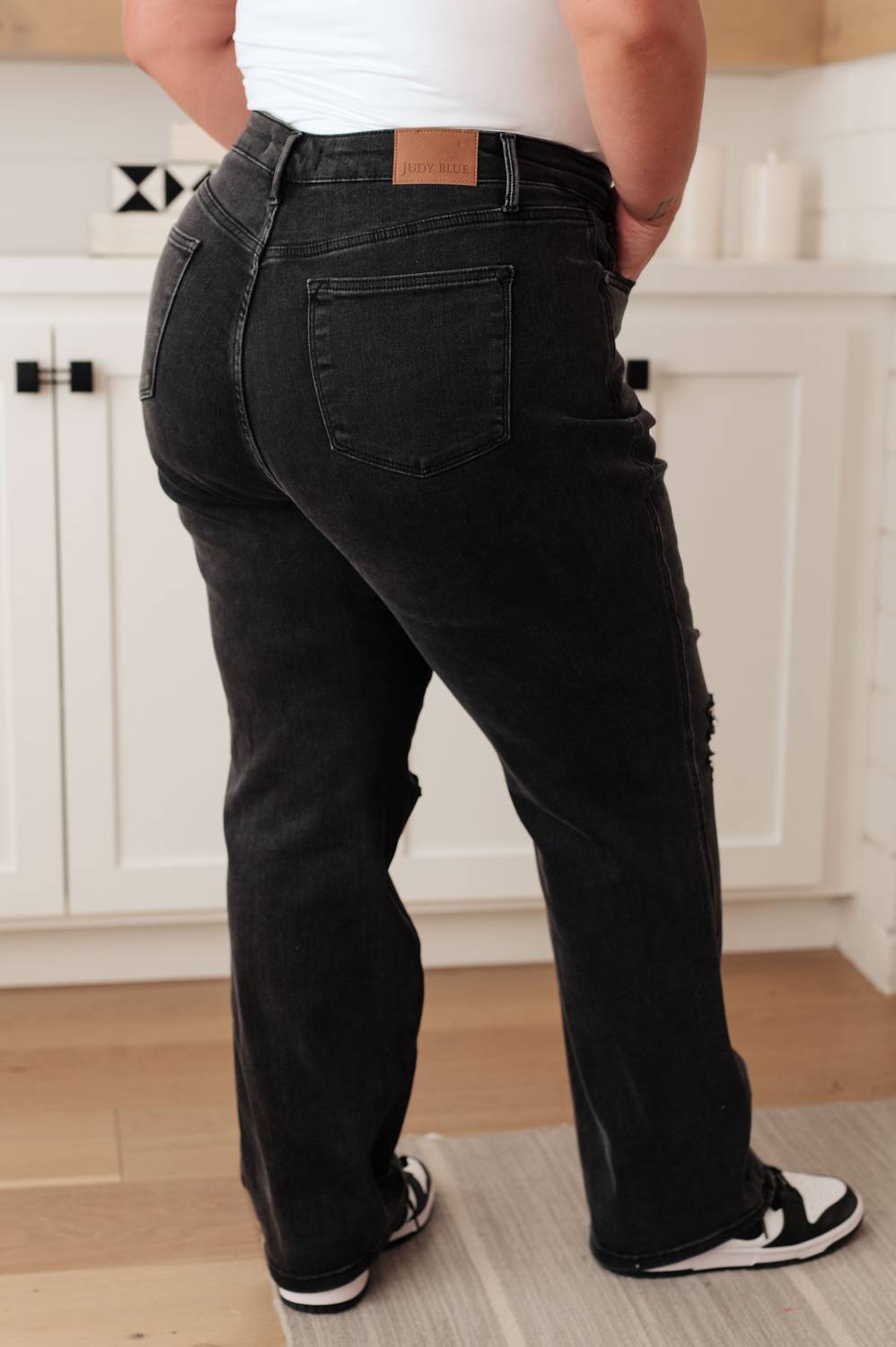 Introducing the Judy Blue High Rise Rigid Magic 90's Distressed Straight Jeans in classic black, designed for effortless style with a grunge twist. These jeans highlight a heavily distressed 90s-inspired straight silhouette and offer exceptional comfort with a 100% cotton rigid front panel and a 4-way stretch back panel. Composition: Front Panel - 100% Cotton; Back Panel - 69% Cotton, 23% Polyester, 7% Rayon, 1% Spandex. Closure: Zip closure. Care: Machine wash and tumble dry. Dimensions: Inseam 32", with sizes ranging from Waist 26" to 44". Model Amanda wears size 0/24, while Model Kirra wears size 13/31.