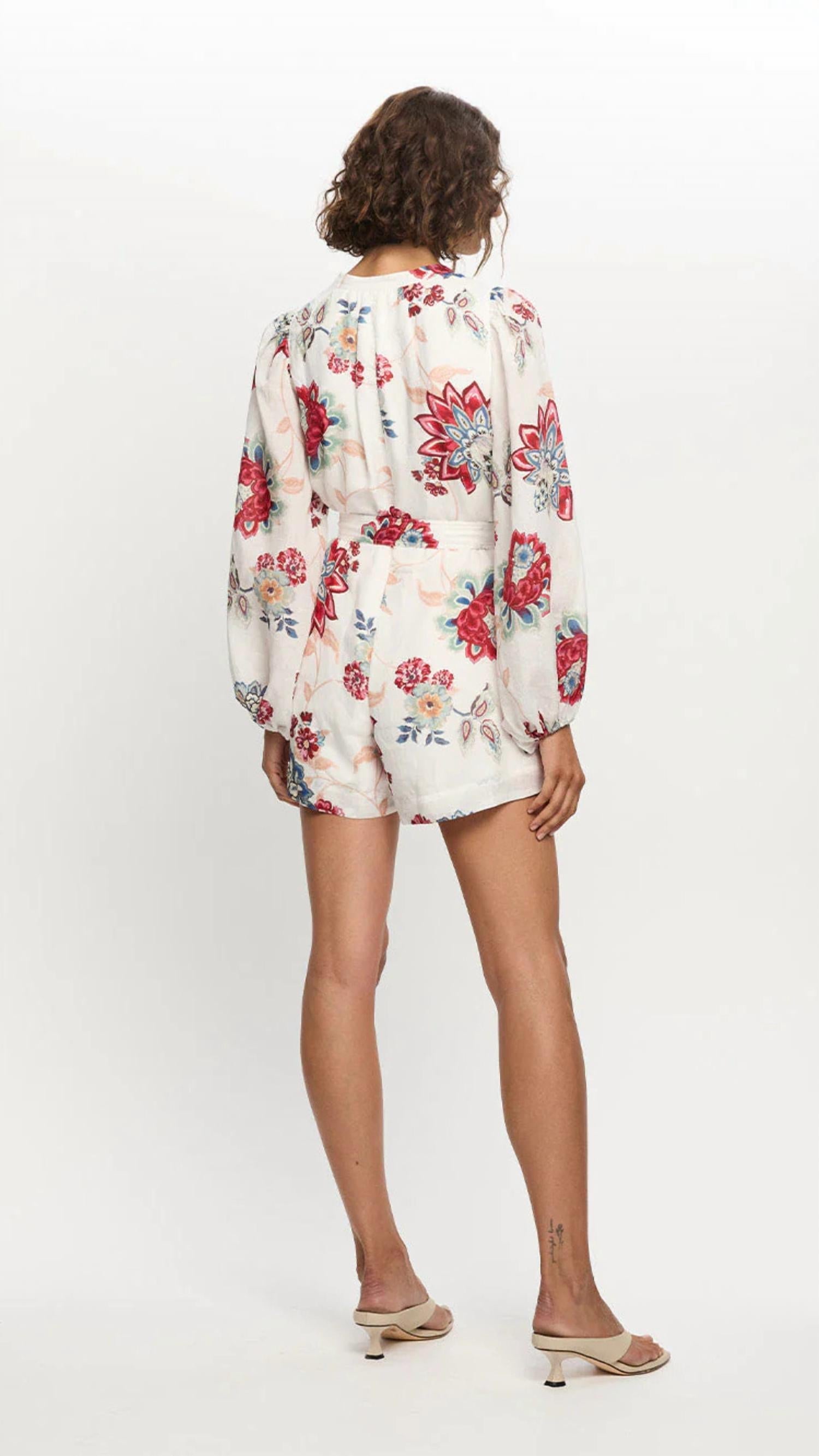 Throw it on and go! Introducing the Provence Playsuit by KIVARI, a perfect blend of style and comfort in floral red and blue on a soft white base. Featuring full-length blouson sleeves and a relaxed shift silhouette, it is crafted from 62% Viscose and 38% Linen. The playsuit includes a button-down front and a signature D-ring belt, offering an additional thin waist tie for versatility. Care instructions highlight a gentle hand wash and line dry to maintain its boho-chic appeal.